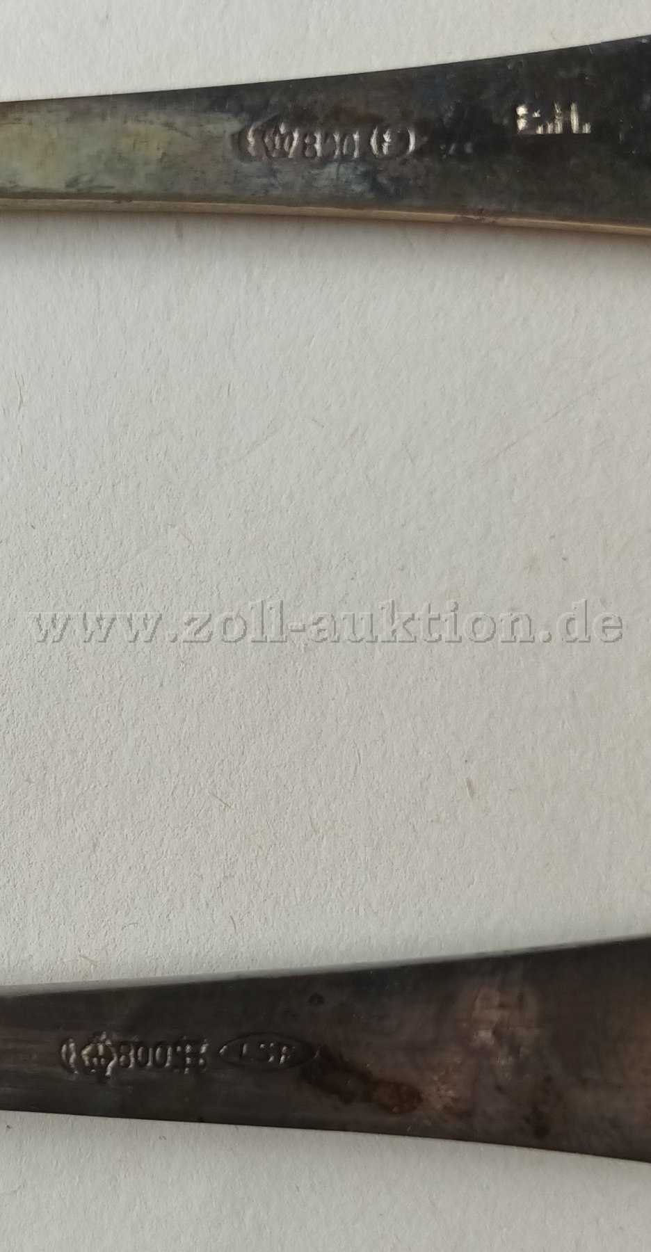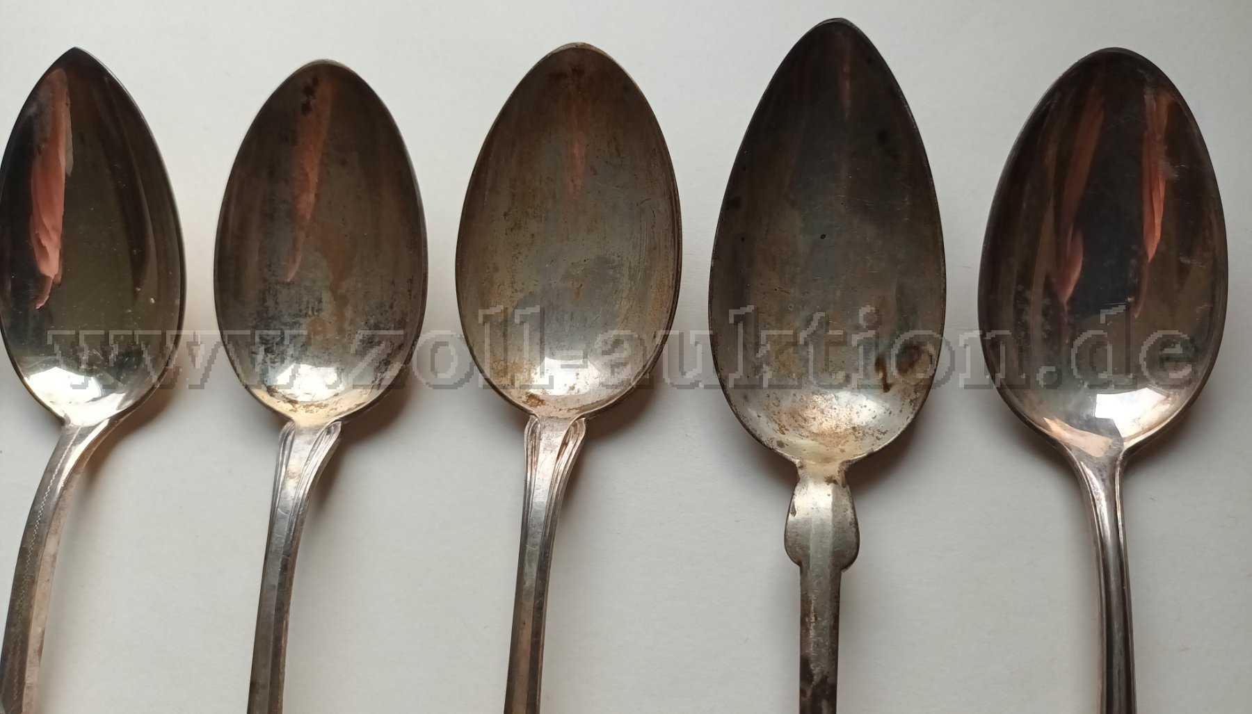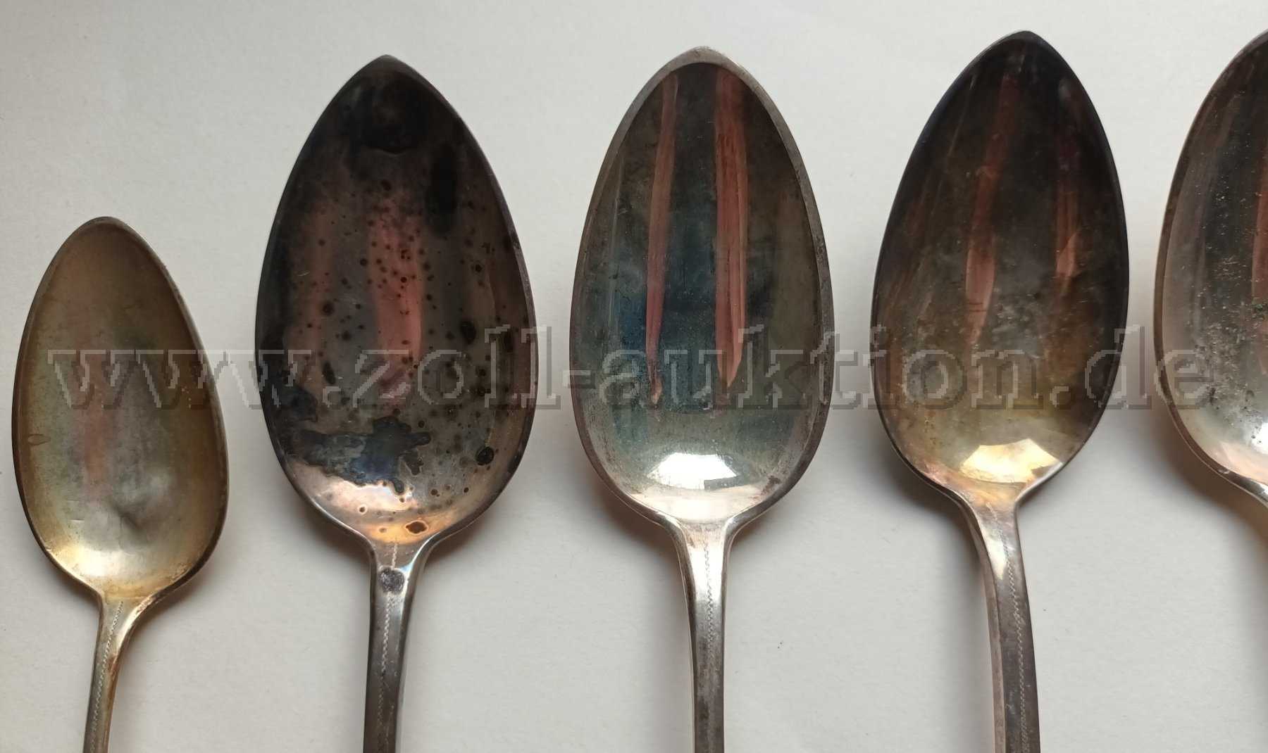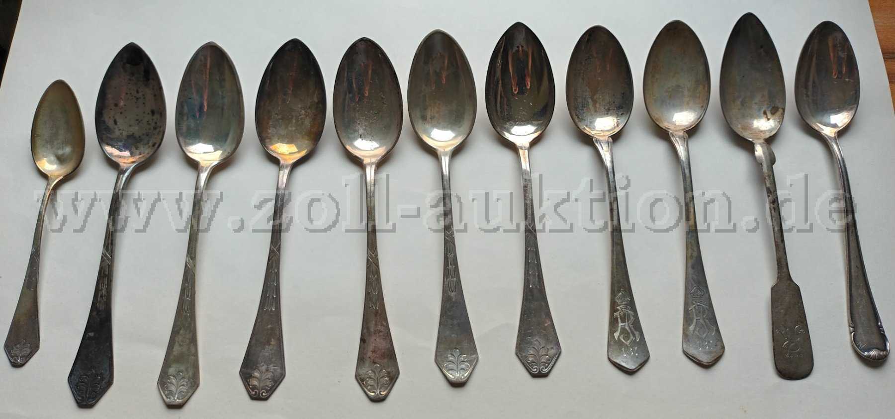 Die angebotenen 11 Suppenlöffel (800er Silber) stammen aus einem Nachlass. Sie sind mit Verschmutzungen und Kratzern versehen sowie angelaufen. Ein Löffel ist leicht verbeult.