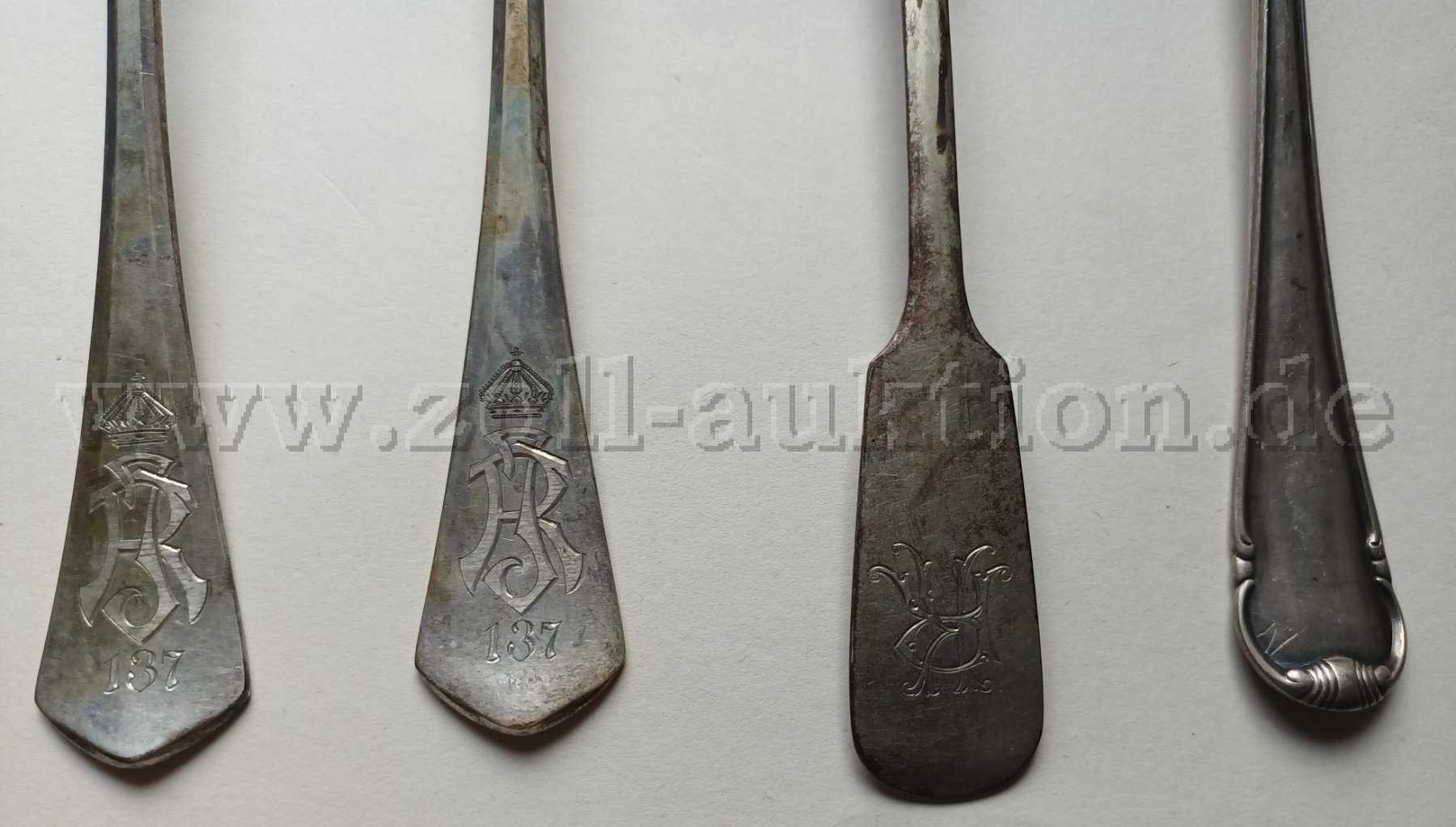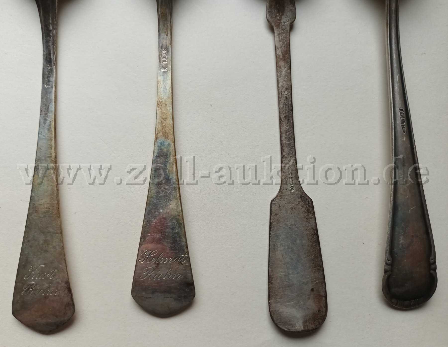 Die Löffel sind teilweise unterschiedlich groß und haben unterschiedliche Muster. Alle Löffel sind mit der Punze 800 versehen. Ansonsten sind teilweise Initialen, Zahlen und Buchstaben, Namen, Halbmond, Krone, etc. eingraviert.