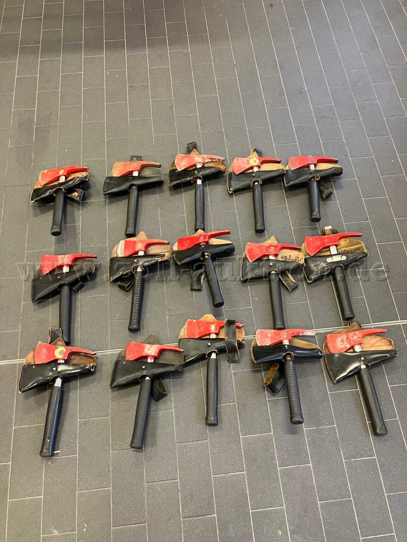 Zur Auktion angeboten werden 15 gebrauchte Feuerwehrbeile mit Holster.
