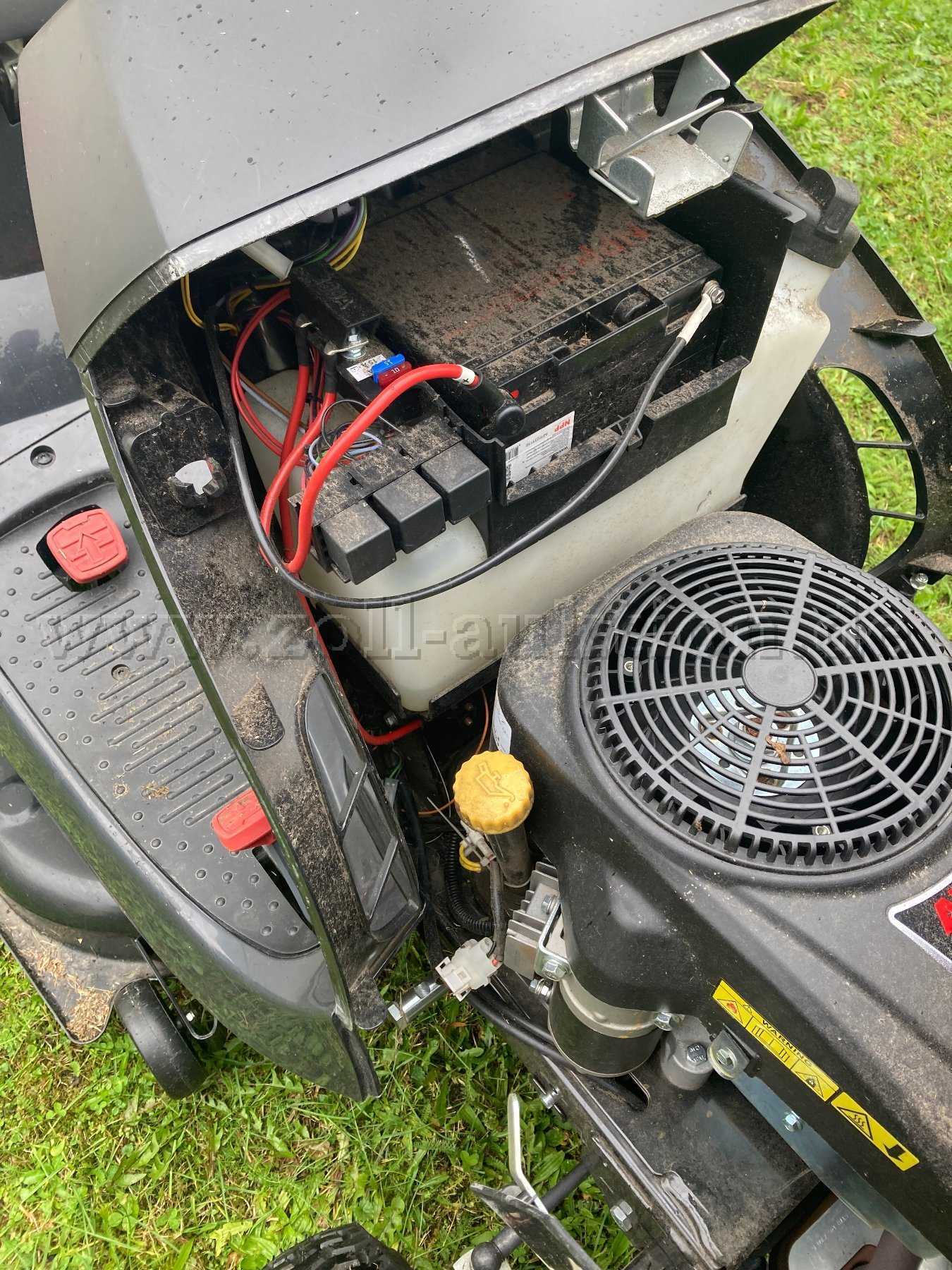 Es handelt sich um einen gebrauchten Rasentraktor. Der Rasentraktor ist durch den Gebrauch verschmutzt. Er hat Gebrauchsspuren an der Verkleidung (Einstieg/ Ausstieg), linke Seite Verkleidung, rechts hinten, das Lenkrad ist etwas abgegriffen.