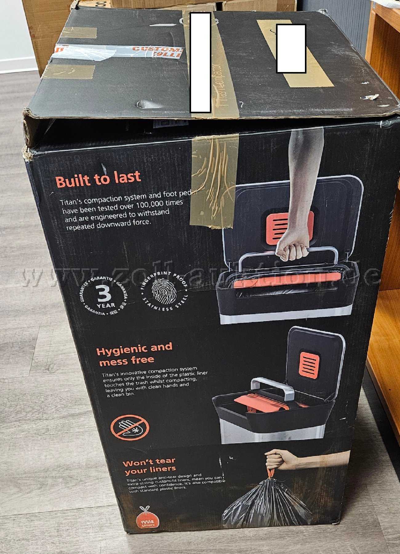Der neue Abfalleimer befindet sich in der Originalverpackung des Herstellers.