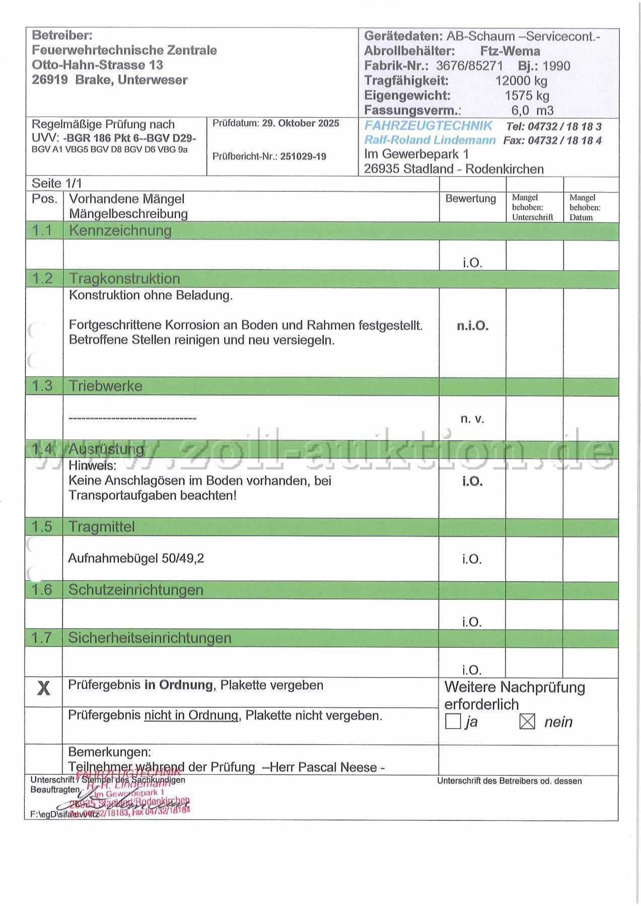 Bei der Behälterprüfung im Oktober 2025 wurde zwar eine Plakette erteilt, jedoch mit dem deutlichen Hinweis auf fortgeschrittene Korrosion an verschiedenen Bauteilen.