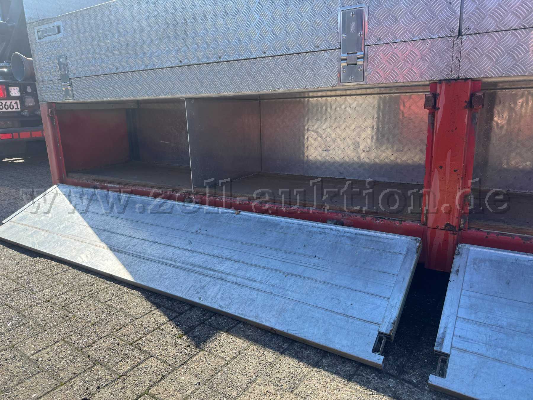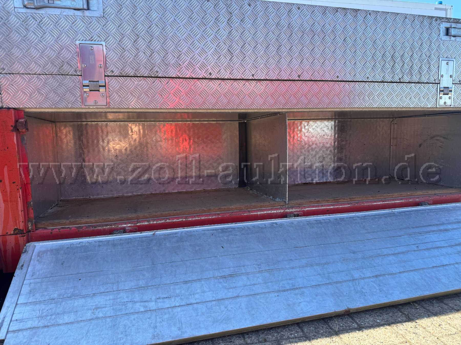 - Rechte Fahrzeugseite: Mehrere Gerätefächer, die ursprünglich zur Aufnahme von Atemluftflaschen sowie Pressluftatmern (PA) vorgesehen waren.