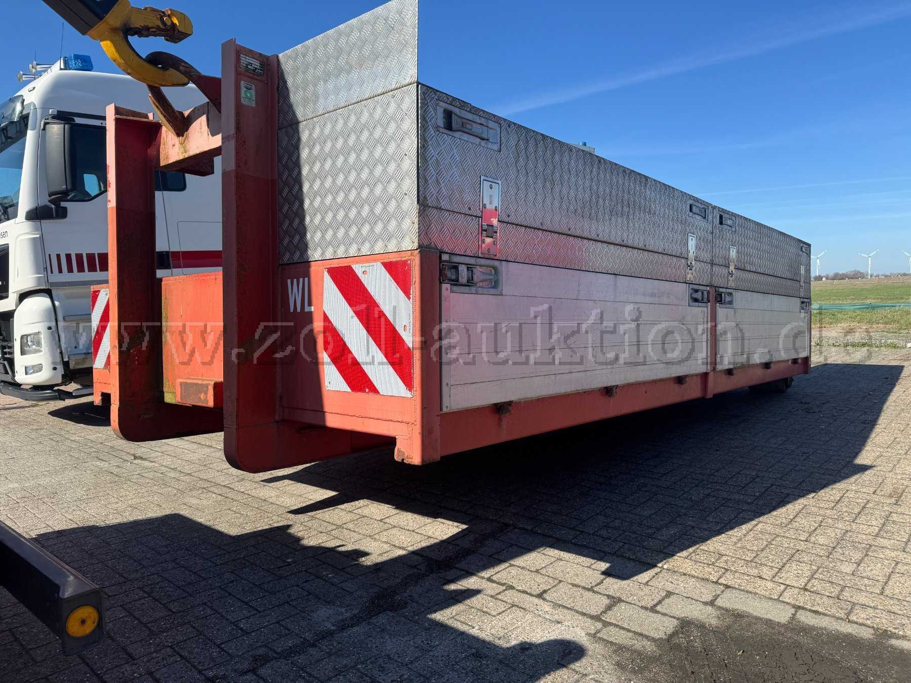 Zur Versteigerung steht ein gebrauchter Abrollbehälter, der zuletzt zur Einsatznachversorgung genutzt wurde. Der Behälter weist eine einsatztypische Ausstattung sowie deutliche Gebrauchsspuren auf.
