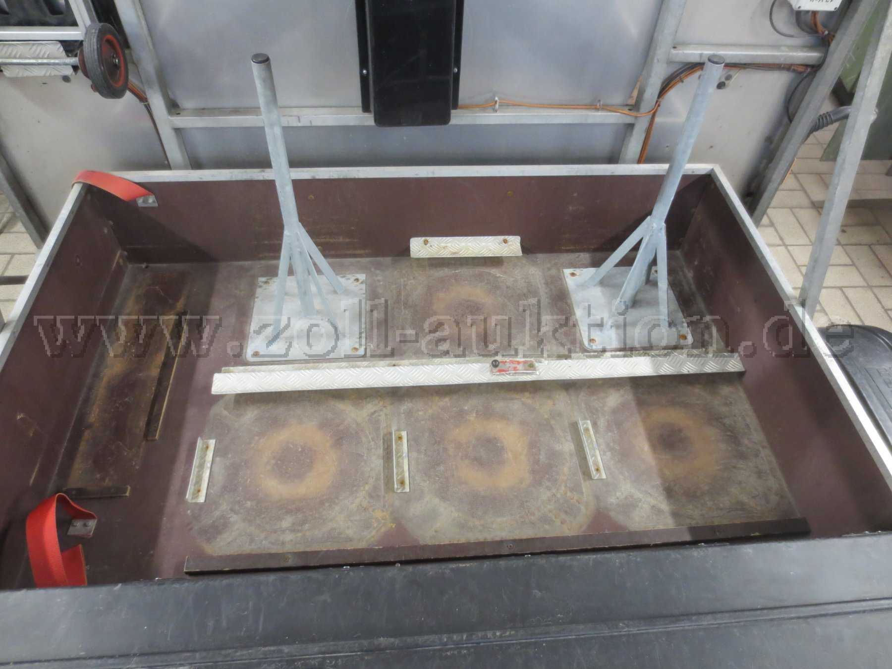 Feuerverzinkter Aufbau m. wasserfesten Siebdruckplatten, gebremste Achse, kurbelbares Stützrad, zwei Ausdrehstützen hinten unten, elektromechanische Hebe- und Senkvorrichtung für obere Tafelhälfte, Batterie- und Gerätekasten aus Kunststoff, 27 Leuchten (Warnlichtanlage), Funk- und Kabelfernbedienung für Warnlichtanlage, Handkurbel für Ausdrehstützen, Transportwagen für Leitkegel, 2 Kegelhalter auf der Ladefläche, zusätzl. Halter für 3 separate Kegel, 2 Fahrzeugwarndreiecke, 2 Metallunterlegkeile