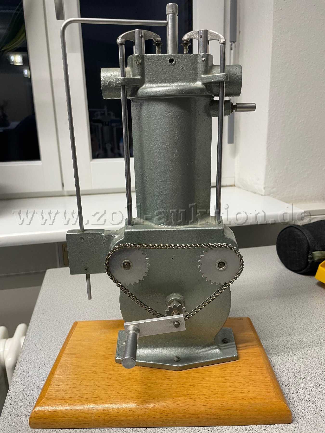 Zur Versteigerung steht ein Anschauungs- und Lehrmodell des Zylinders eines Dieselmotors in massiver Metallausführung, montiert auf einem stabilen Holzsockel. Das als Schnittmodell ausgeführte Modell zeigt übersichtlich Zylinder, Kolben, Pleuel, Kurbeltrieb, Ventile sowie Ansaug- und Abgaskanäle. Die typische Funktionsweise des Dieselmotors mit Selbstzündung ist gut nachvollziehbar.