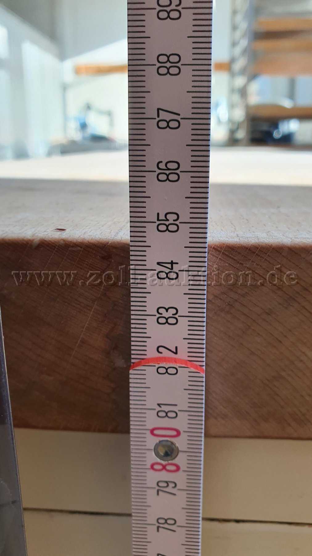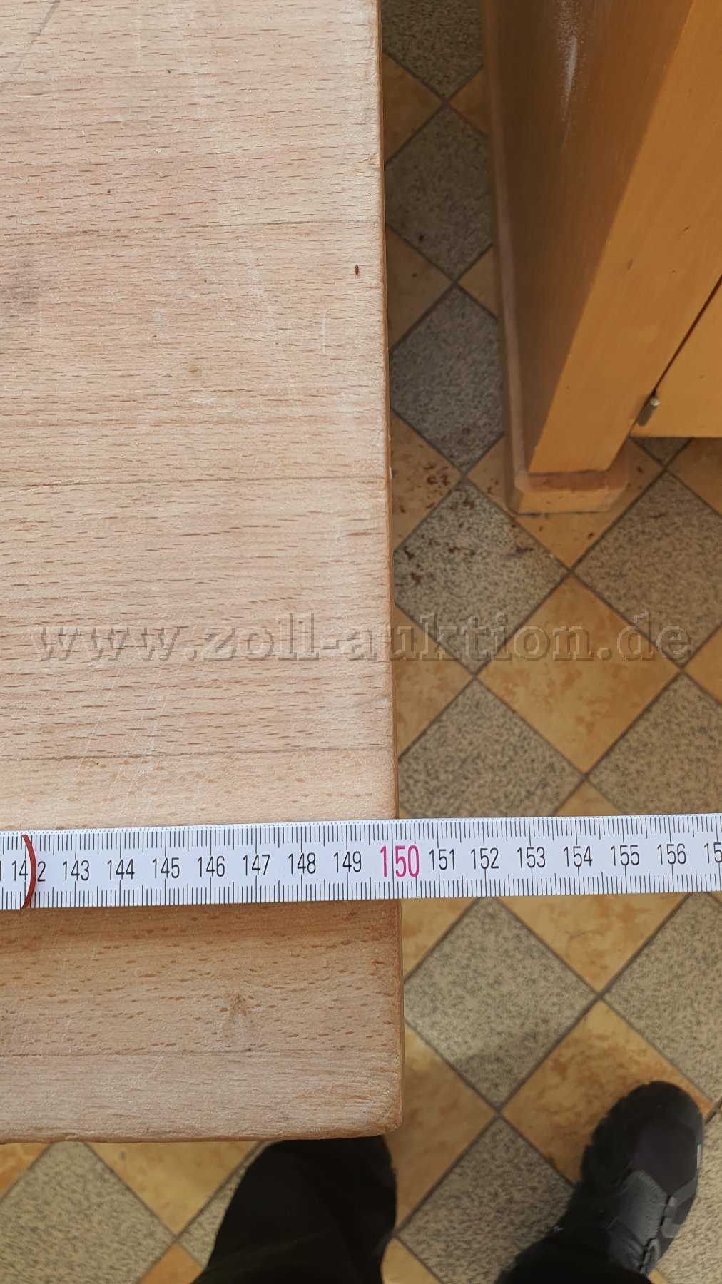 Die Arbeitsplatte ist 150 cm lang, 80 cm tief und hat eine Plattenstärke von 5 cm.