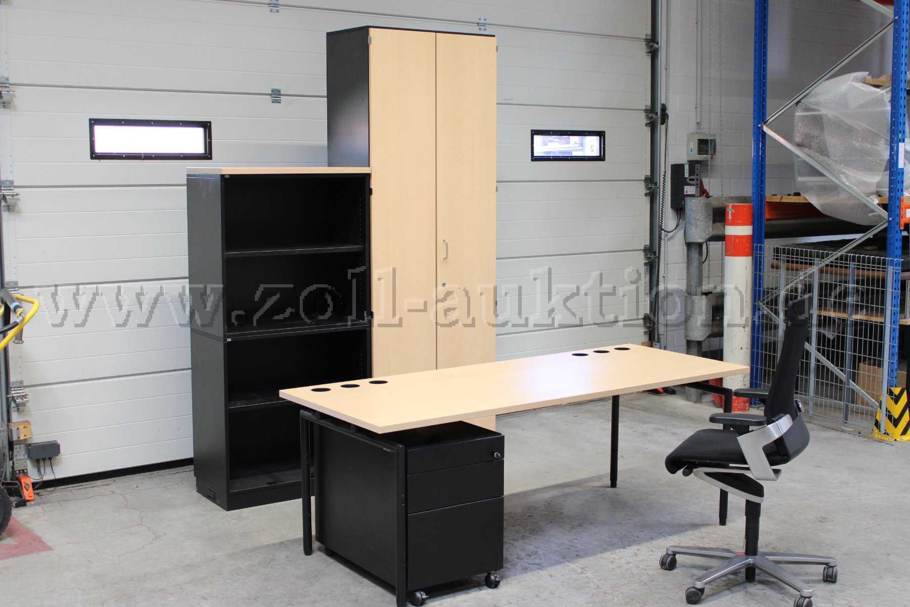 Bestehend aus 1 Schreibtischen, 1 Untertischcontainer, 3 Regalschränken, 1 Drehstuhl