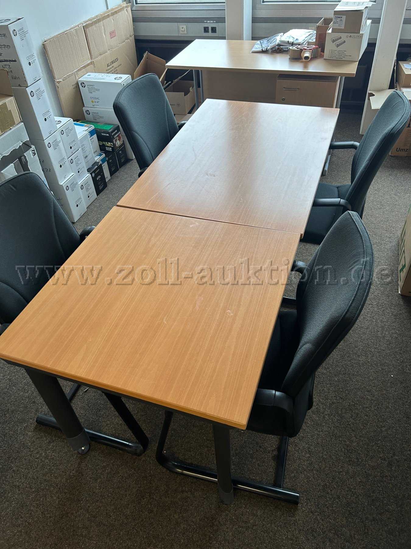 Zur Versteigerung steht eine vollständige Büroeinrichtung, bestehend aus insgesamt 4 Tischen, 5 Stühlen, 1 Kleiderschrank, 3 Aktenschränken (2 mit Schiebetüren) und 1 Rollcontainer.