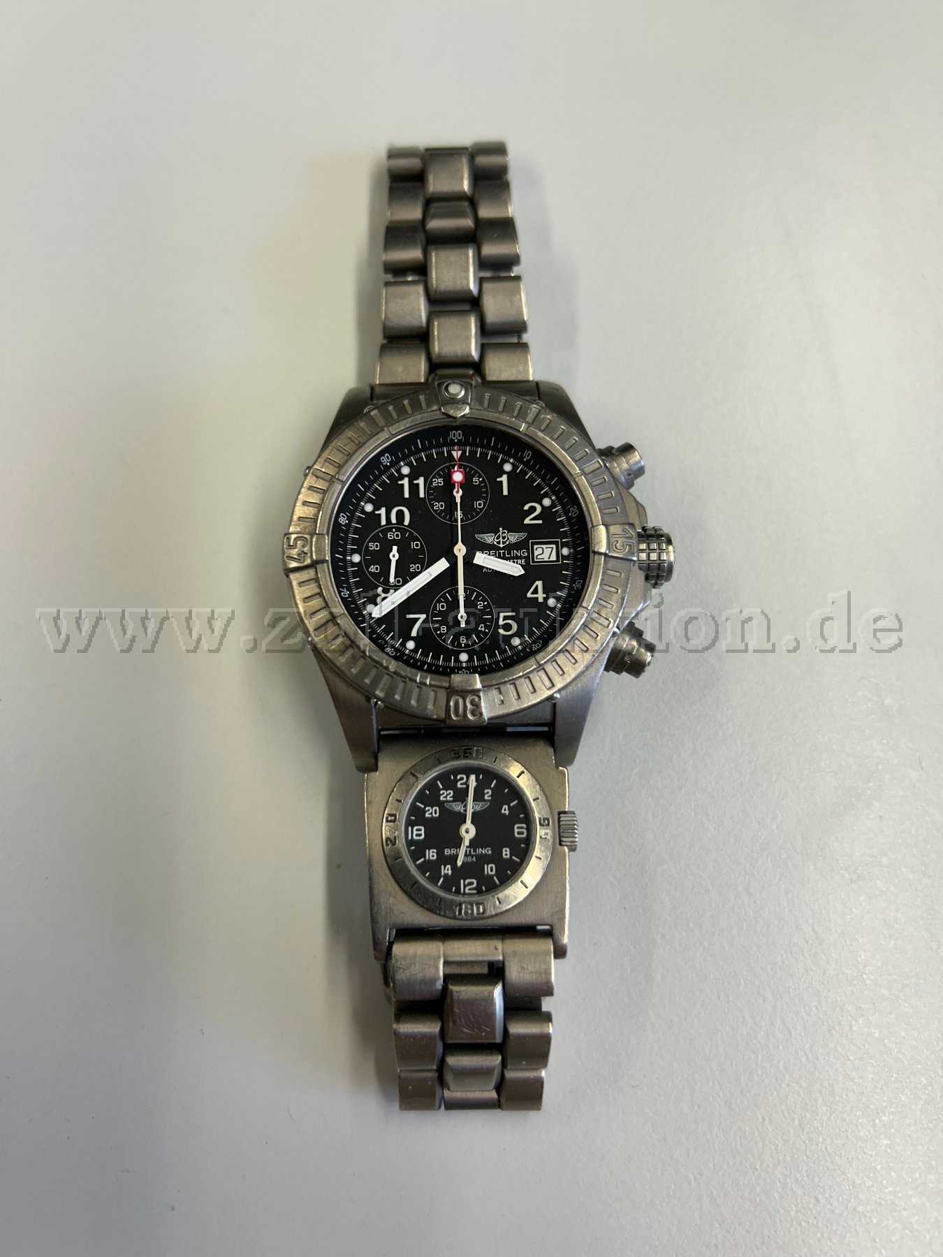 Versteigert wird eine BREITLING Armbandchronograph Modell Chrono Avenger Referenz E13360, Gehäuse- und Werknummer 448044, Schweiz um 2010, Automatik, Chronometer in Titan inklusive Gliederband mit Falzschließe, Boden und Krone verschraubt, Lünette mit 60-Minuten-Einteilung einseitig rastend drehbar, Saphirglas entspiegelnd beschichtet, rhodiniertes Werk, Kaliber ETA 7750, 25 Steine, Zentralrotor, quarzgesteuerte UTC-Uhr zwischen Gehäuse und Band, Durchmesser ca. 44mm, Länge ca. 21,5 cm. Etui und Papiere sind nicht vorhanden.