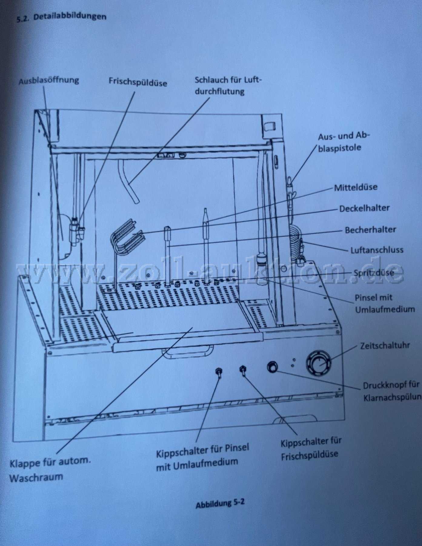 Weiterhin befinden sich im Waschraum ein Pinsel zum manuellen Reinigen von Gegenständen und eine Frischspüldüse.