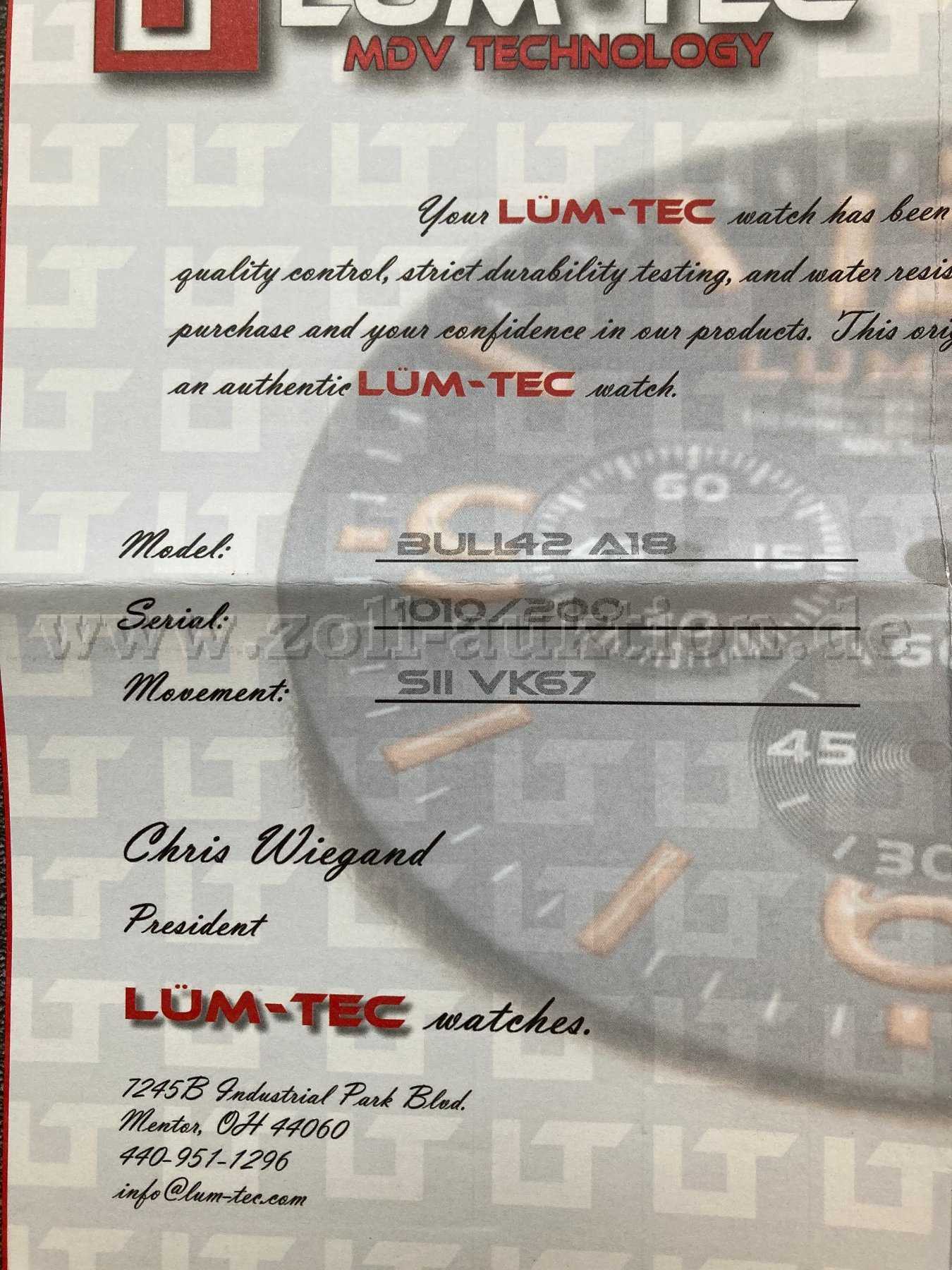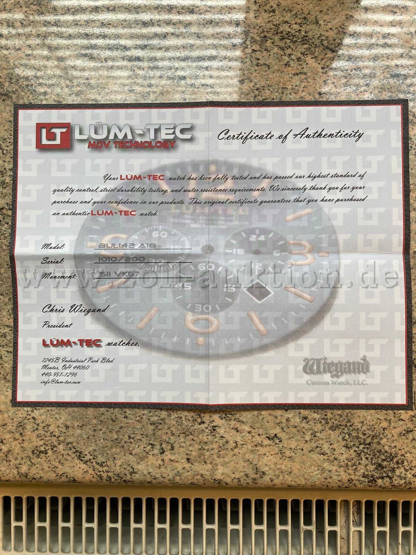 Versteigert wird hier eine BULL42 A18 Uhr der Firma LÜM TEC.