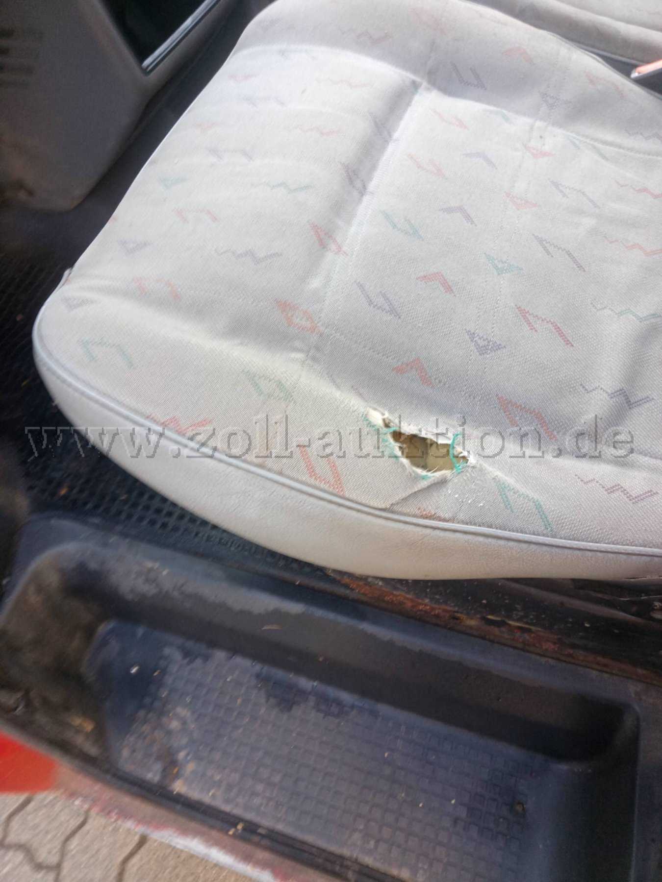 Die gesamte Karosserie, Bodengruppe und sämtliche Anbauteile weisen Dellen, Kratzer, Lackschäden, Korrosionsschäden, Beschädigungen, Steinschläge und Anstoßschäden auf. Der Innen- und Laderaum ist aufgrund der intensiven Nutzung im Bereich der Verkleidungen, Sitzpolster, Bodenbeläge, Bedieneinrichtungen, etc. stark abgenutzt / verschlissen. (Kratzer, Löcher, starke Verschmutzungen, Beschädigungen, beschädigte oder fehlende Bauteile, zusätzlich angebrachte Halterungen und Bauteile, etc.)