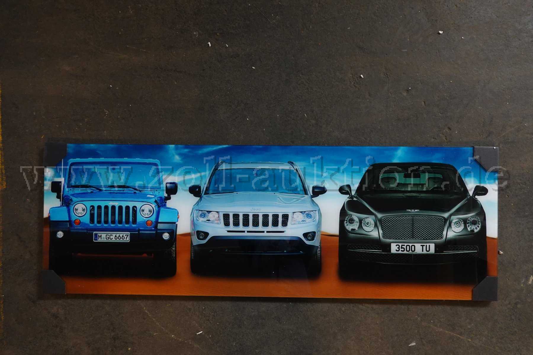 Es handelt sich hierbei um ein Glasbild mit Schutzglas und Kantenschutz und zeigt das Motiv "Jeep & Bentley".