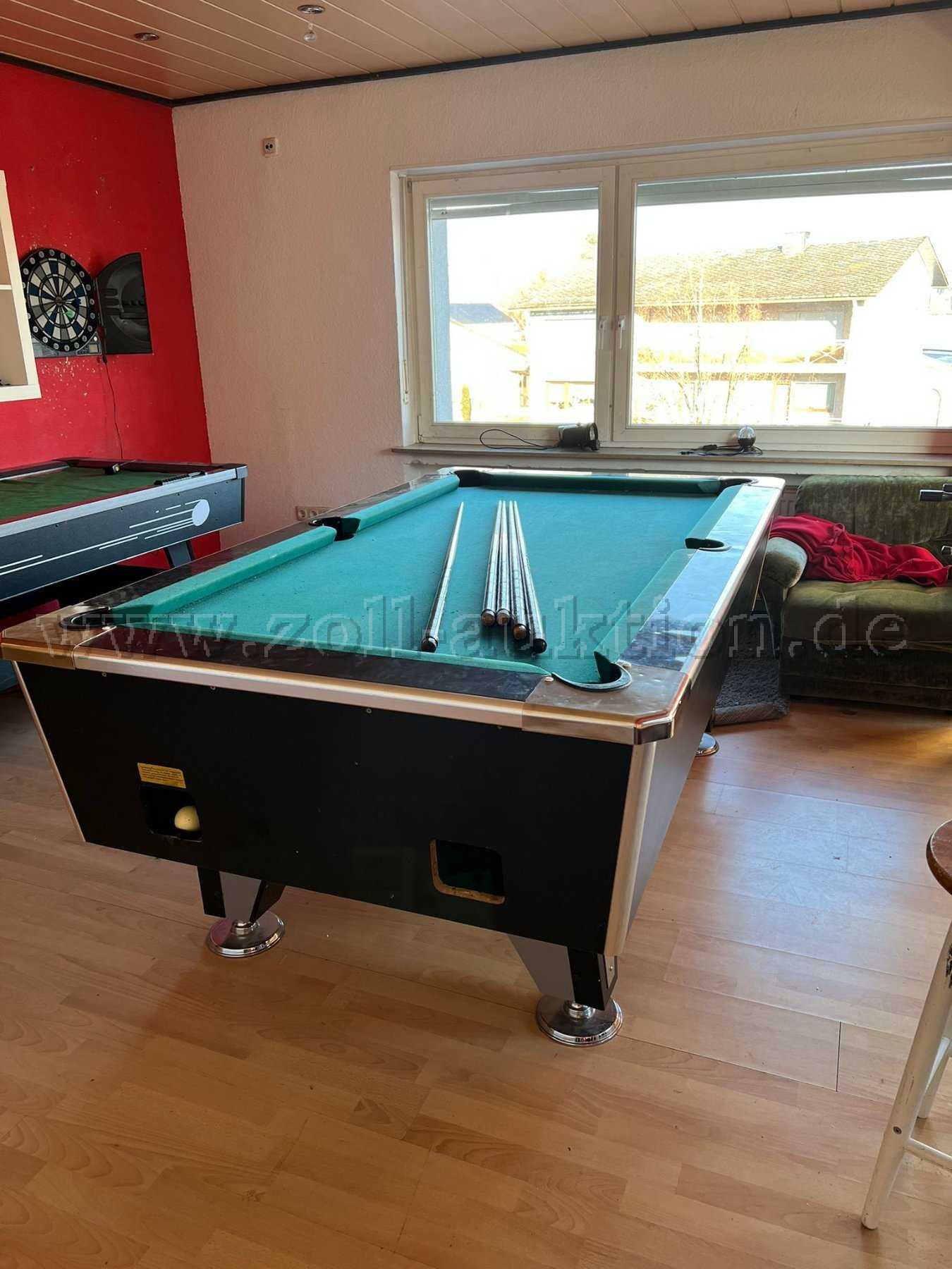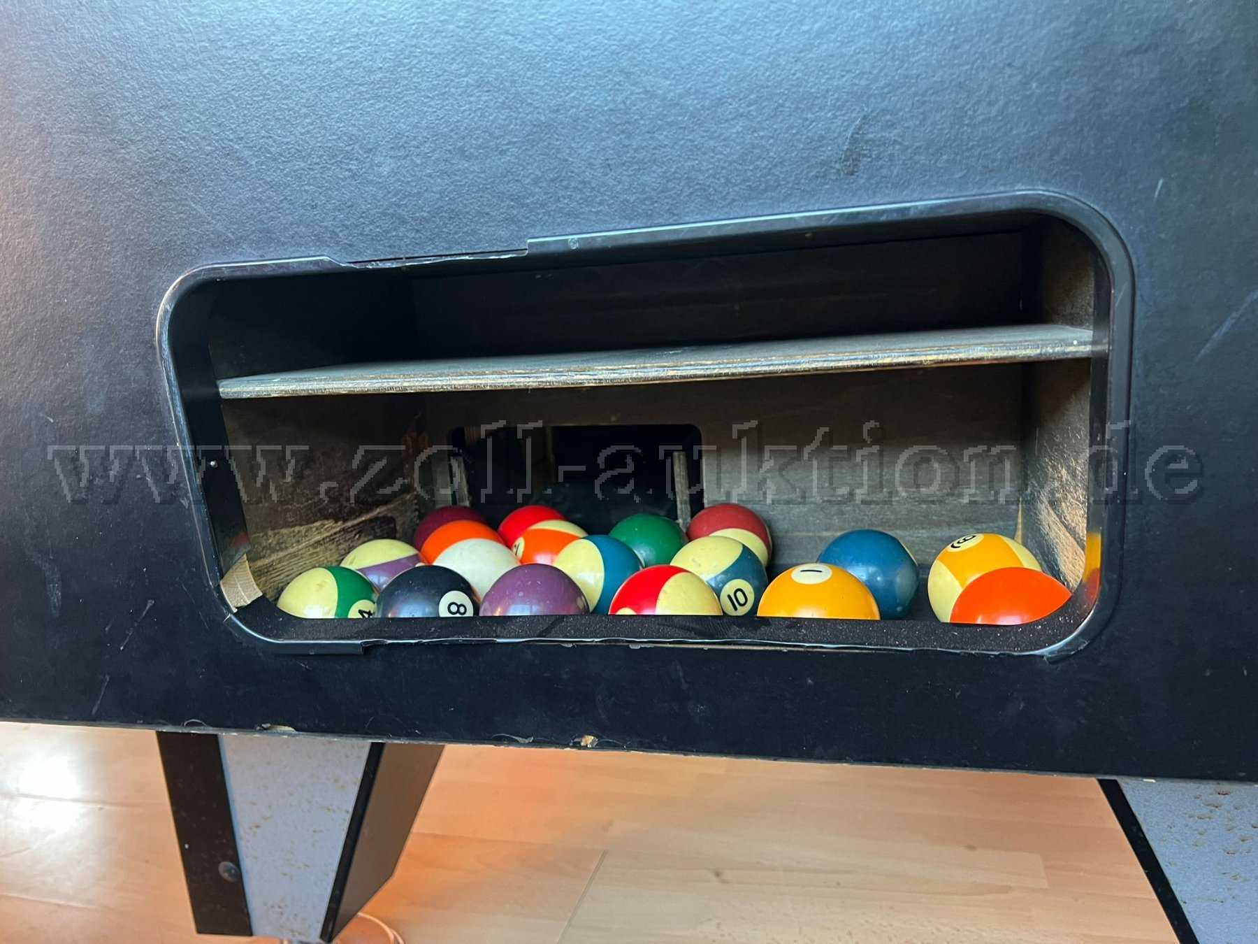 Der Billardtisch ist gebraucht und funktionsfähig. Er weist Gebrauchsspuren und Abnutzungen wie farbliche Verblassungen und leichte Kratzer auf.