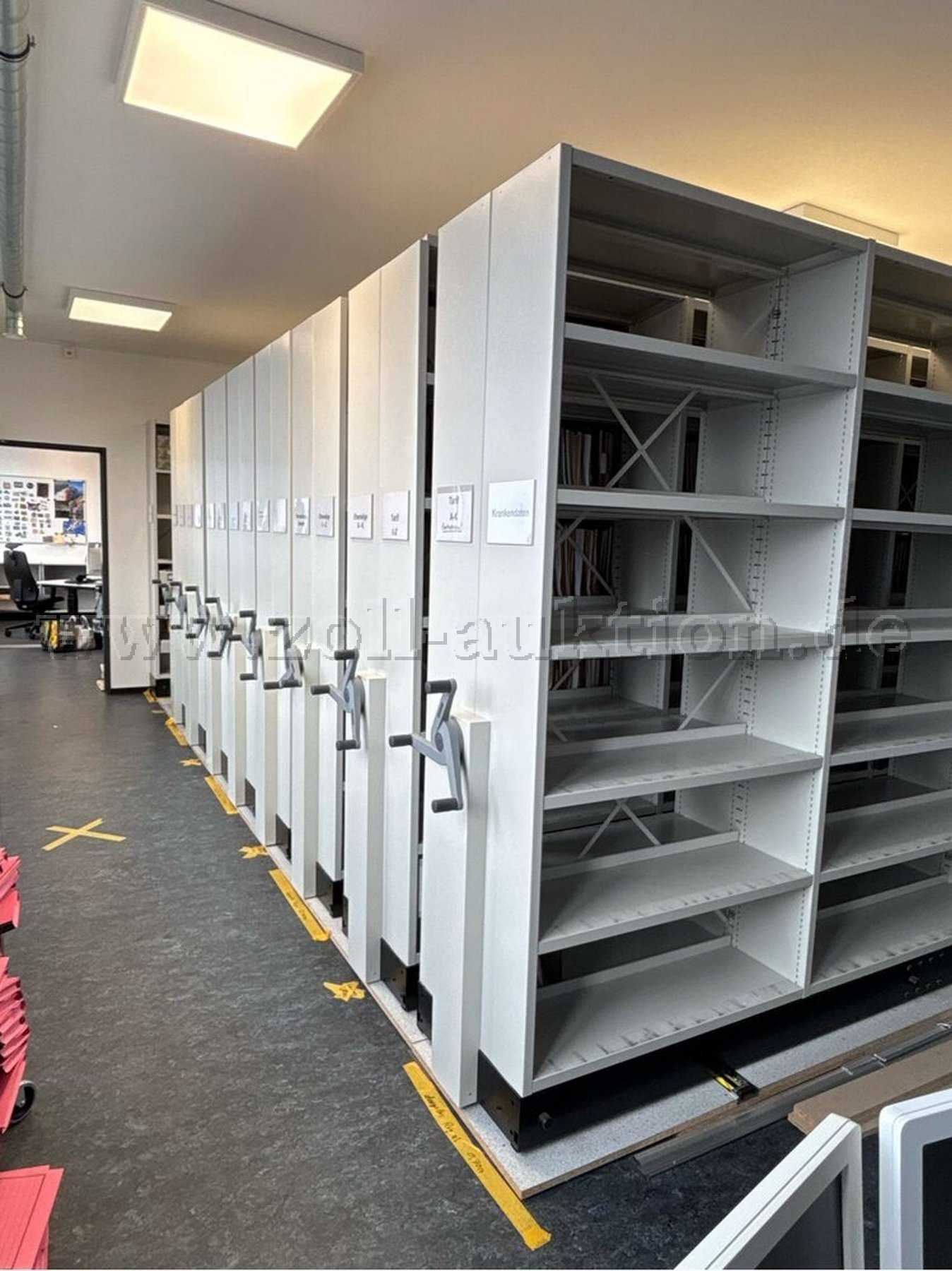 - 8 Stück Rollregalwagen, doppelseitig H: 2396 mm T: 600 mm B: 3340 mm, Einrichtung: Pro Feld 6 Ordnergefache