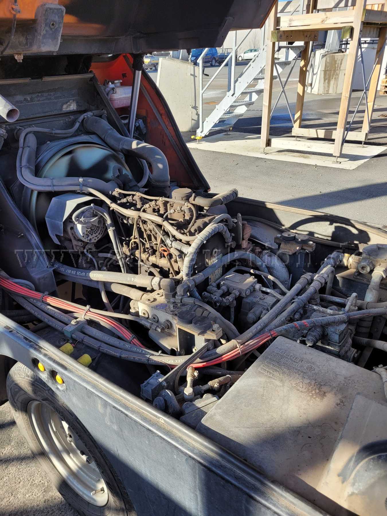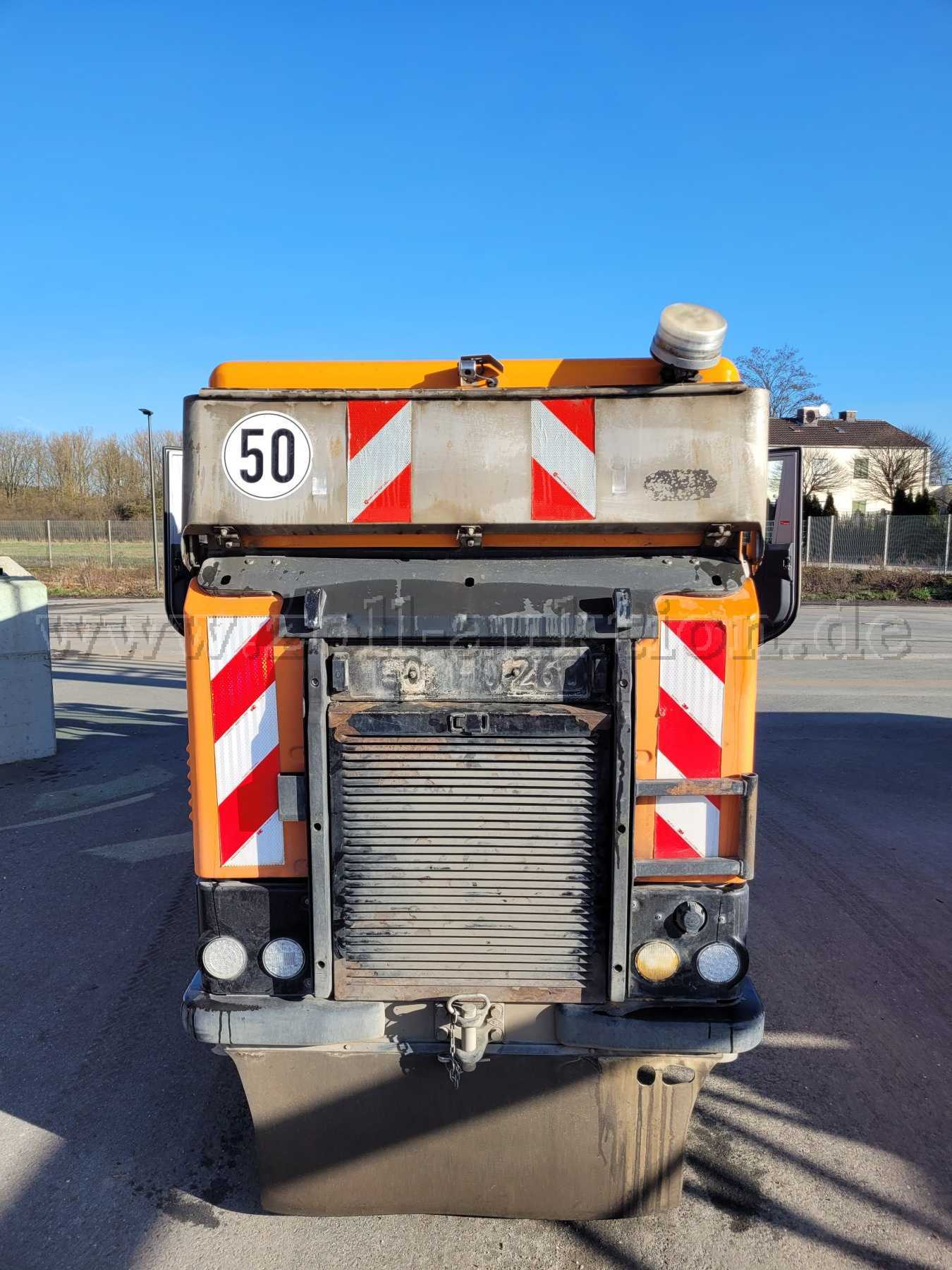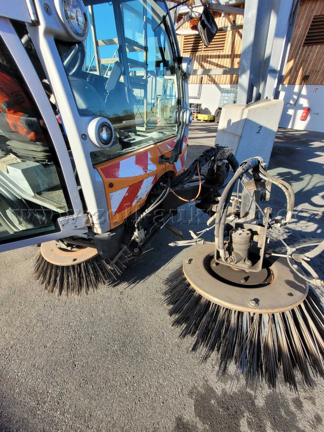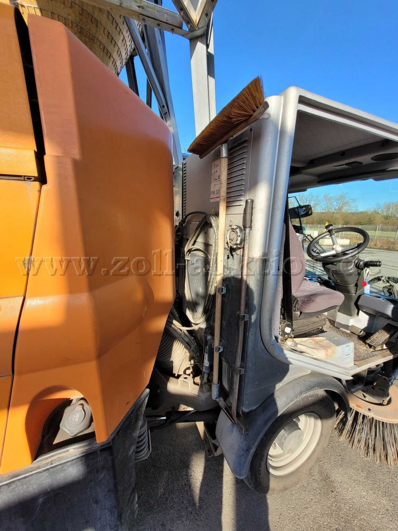 Die Kehrmaschine weist alters- und laufleistungsbedingte Gebrauchsspuren auf, sowie Dellen, Beulen, Lackschäden, Korrosion und Verschmutzung auf