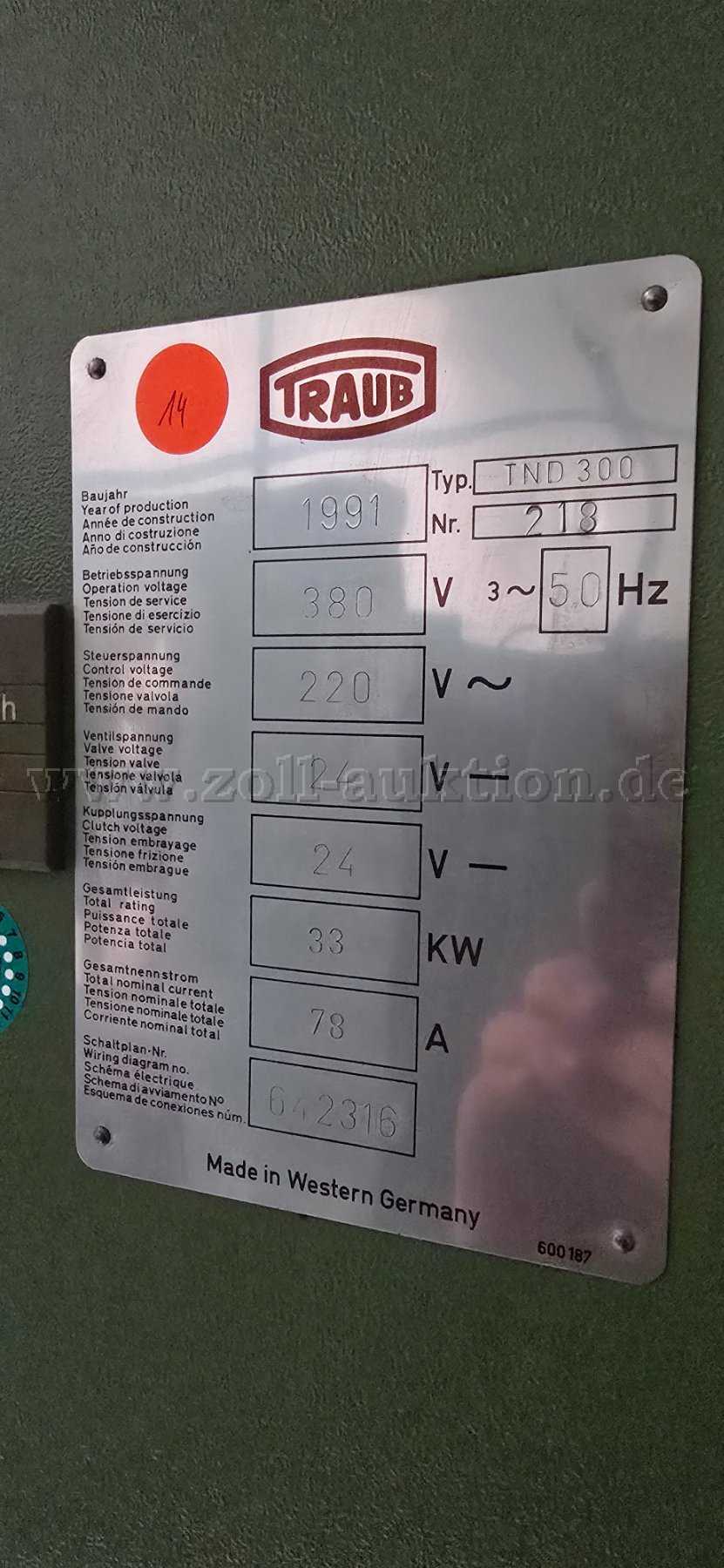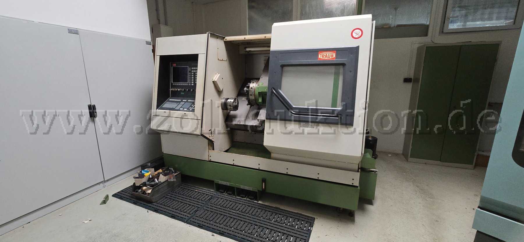 Zur Versteigerung steht eine Traub CNC-Drehmaschine Typ TND 300 aus dem Baujahr 1991.