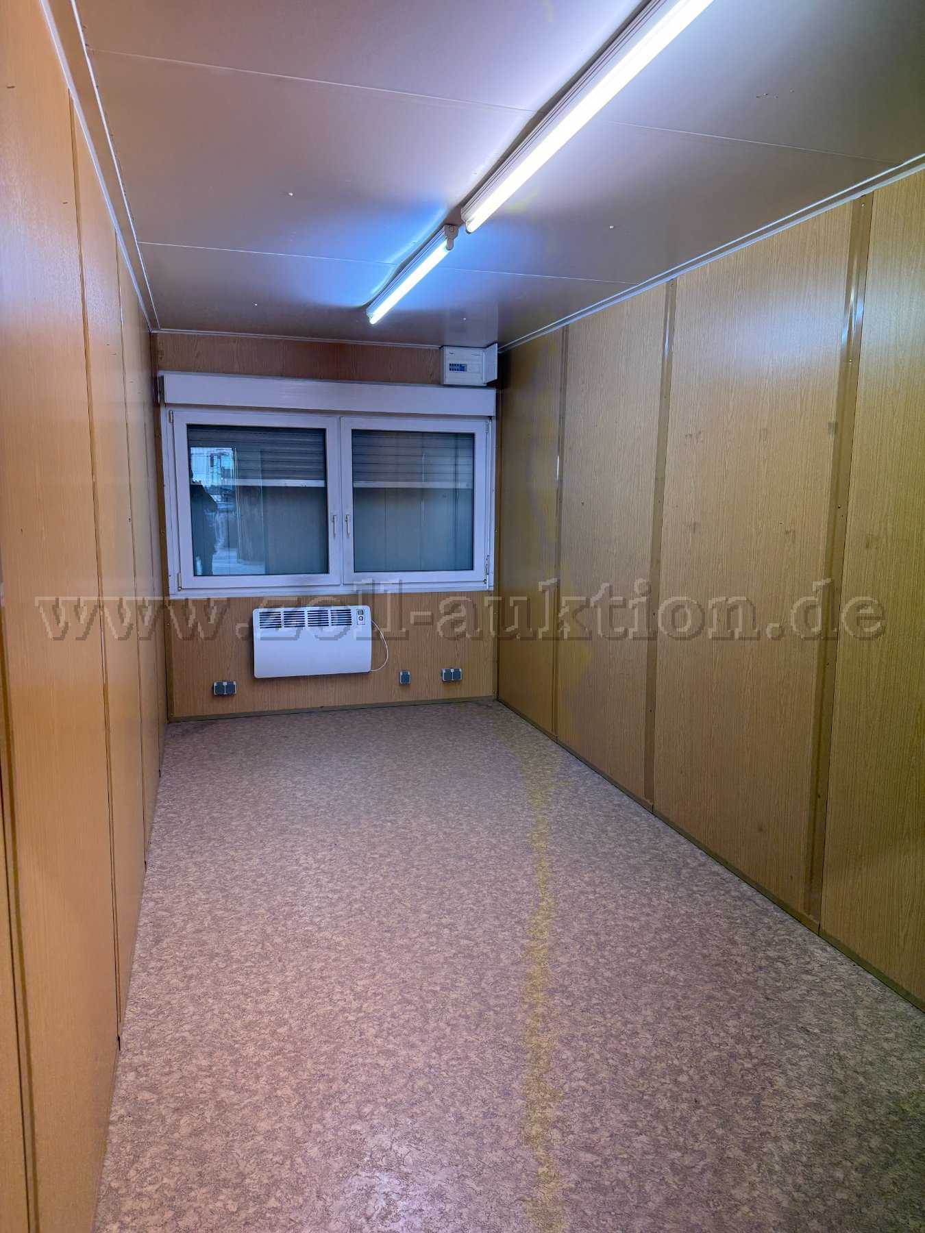 Der Container ist mit 5 Steckdosen auf der Stirnseite ausgestattet. Darüber befinden sich die zweiflügligen Fenster mit Rollladen, die elektrische Heizung und der Sicherungskasten. Beleuchtung und Heizung sind voll funktionsfähig.