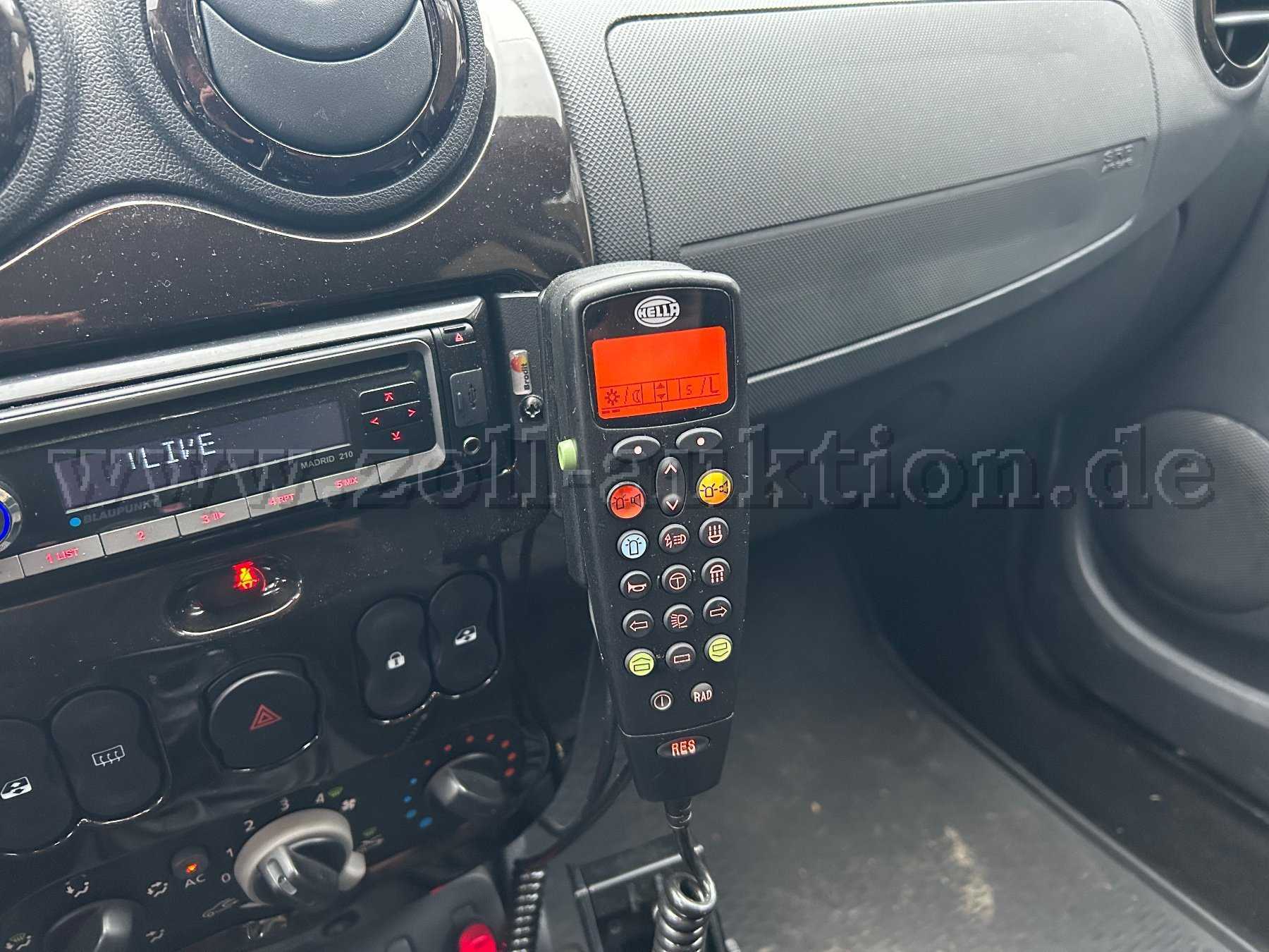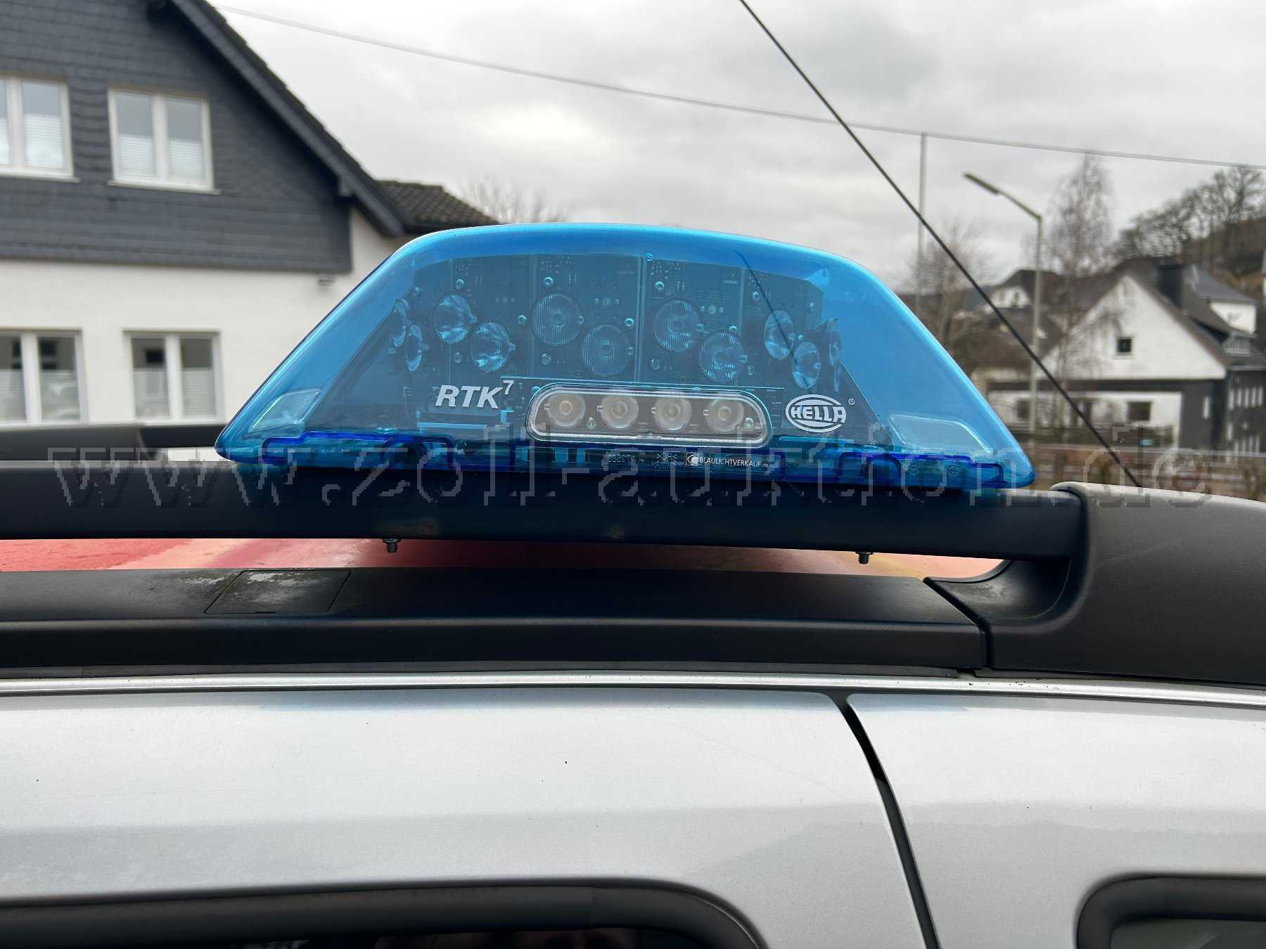 Auf dem Fahrzeugdach ist ein „Hella LED Blaulichtbalken RTK 7“ verbaut, das Bedienelement im Innenraum ist ein „Hella Bedienhandhörer HA 115“