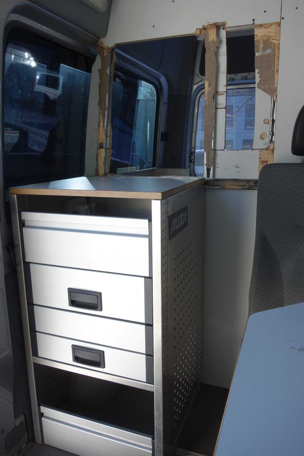 - Fahrzeug Fond + Heckbereich ausgebaut mit Tisch, Sitzmöglichkeiten, Regalen, Stauraum, Spülbecken (siehe Bilder)