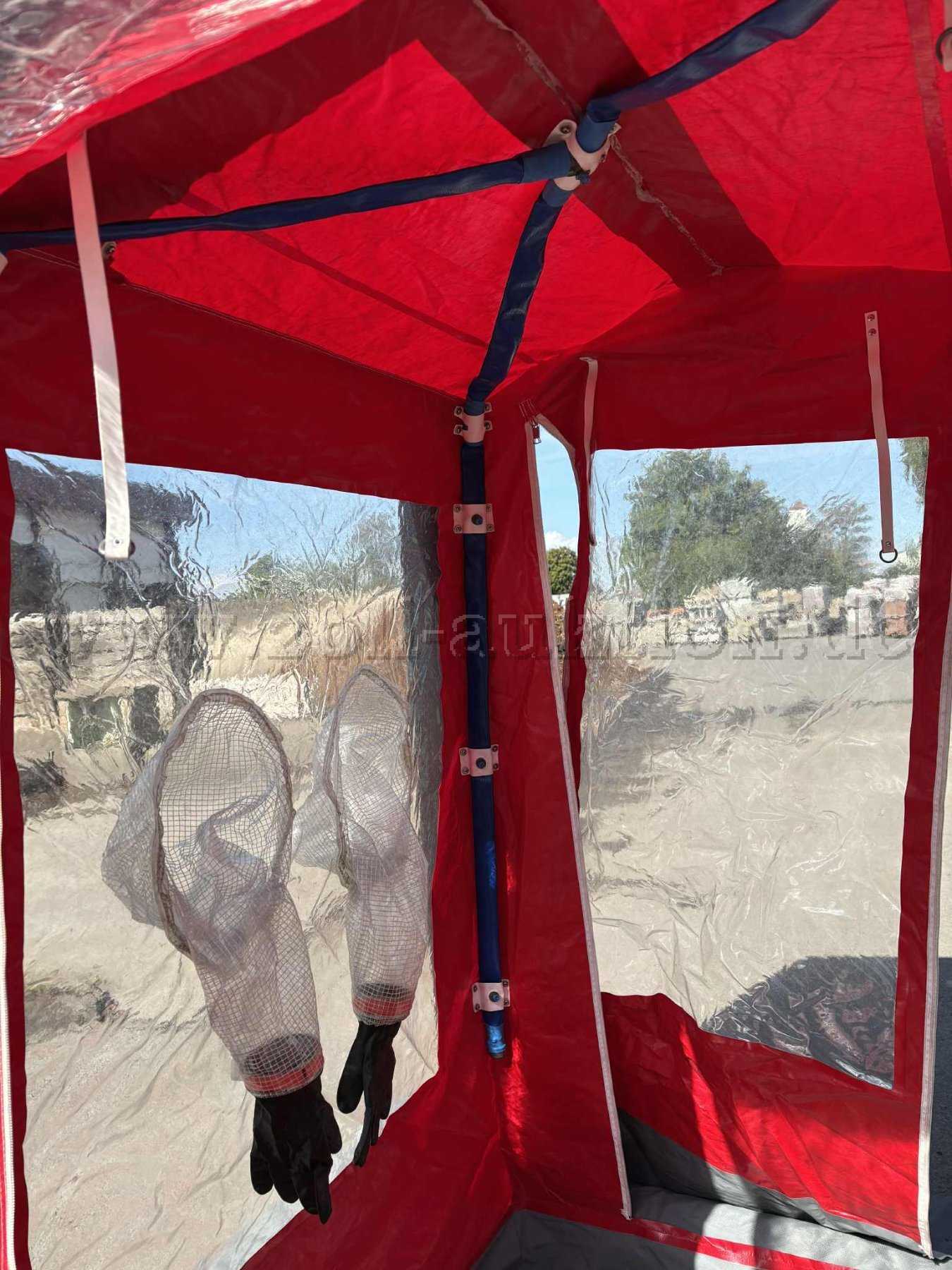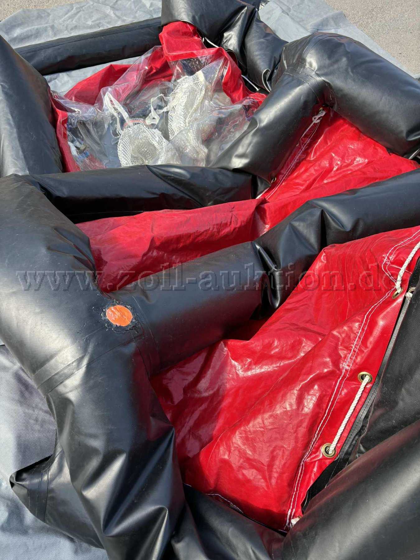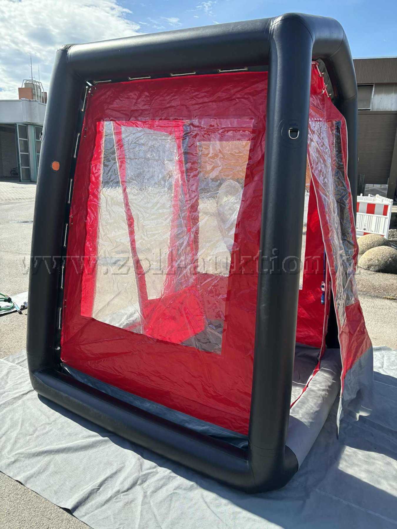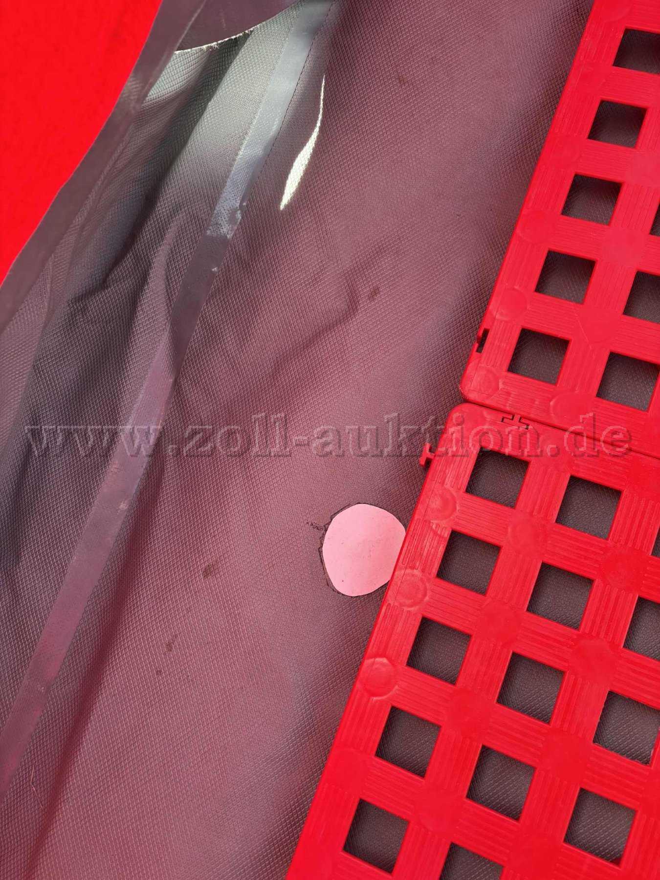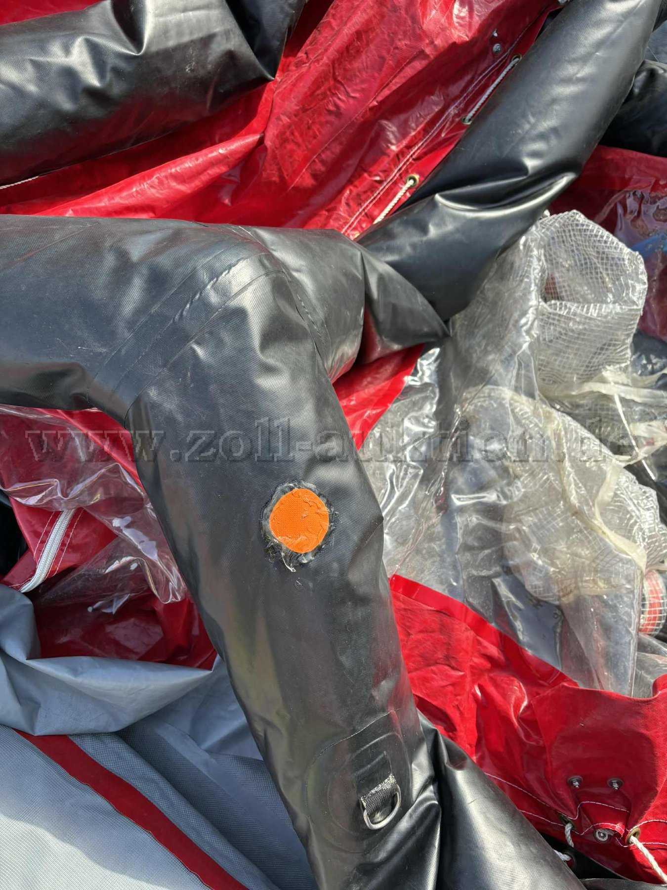 Aufgrund von Luftverlust des Tragegerüsts (nach 2 Stunden bemerkbar), sowie diversen Reparaturen und Gebrauchsspuren („Flickstellen“ des Tragegerüsts), wird die Dekontaminationsdusche mit Zubehör als defekt versteigert.