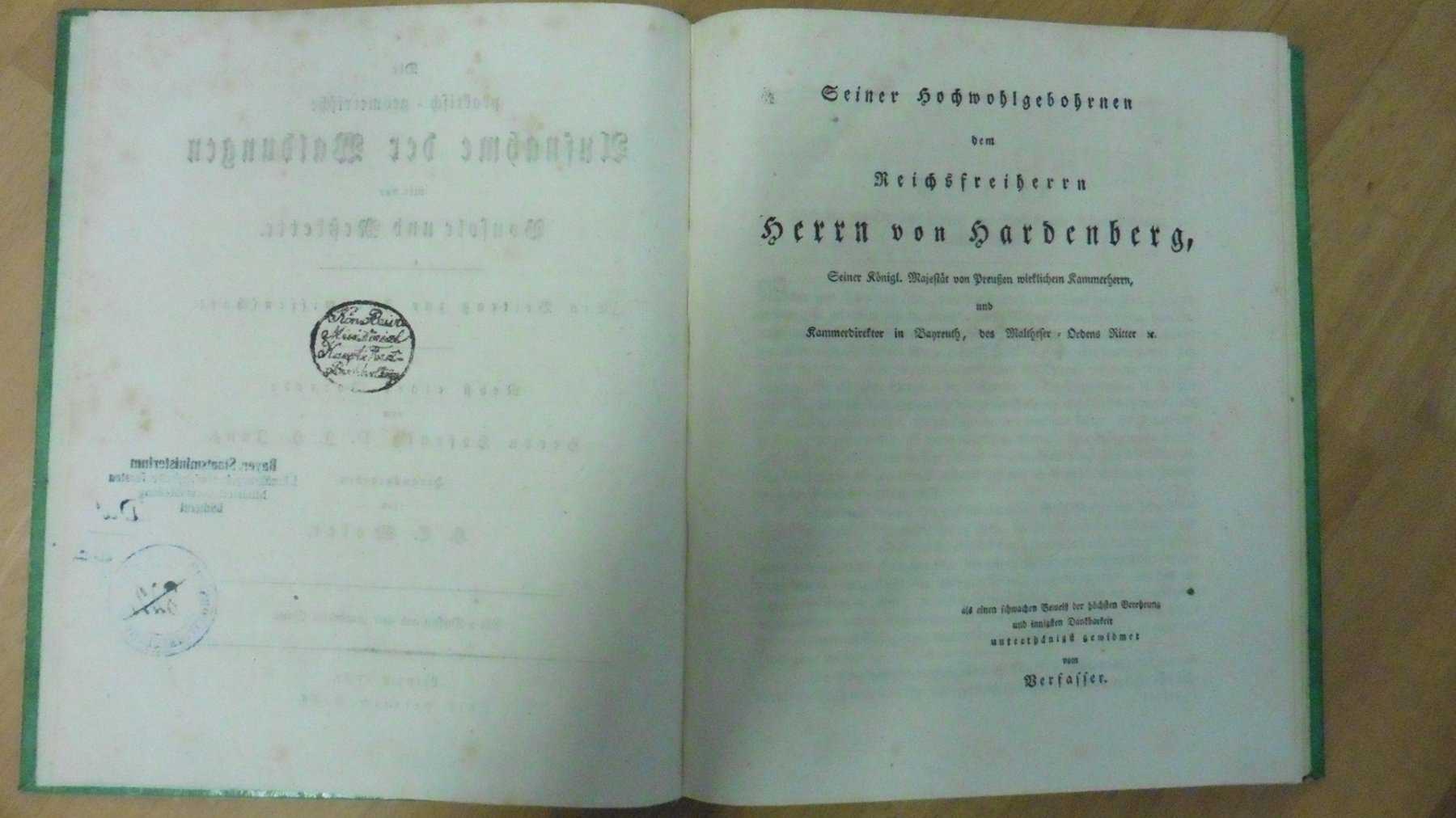 Titelblatt mit Bibliotheksstempel, Umschlag berieben, Bibliotheksaufkleber auf dem Buchrücken, Ecken bestoßen, die Seiten sind nachgedunkelt, geringe Stockflecken, in dem Blatt der Tabelle II ist ein kleiner Riss (siehe Foto).