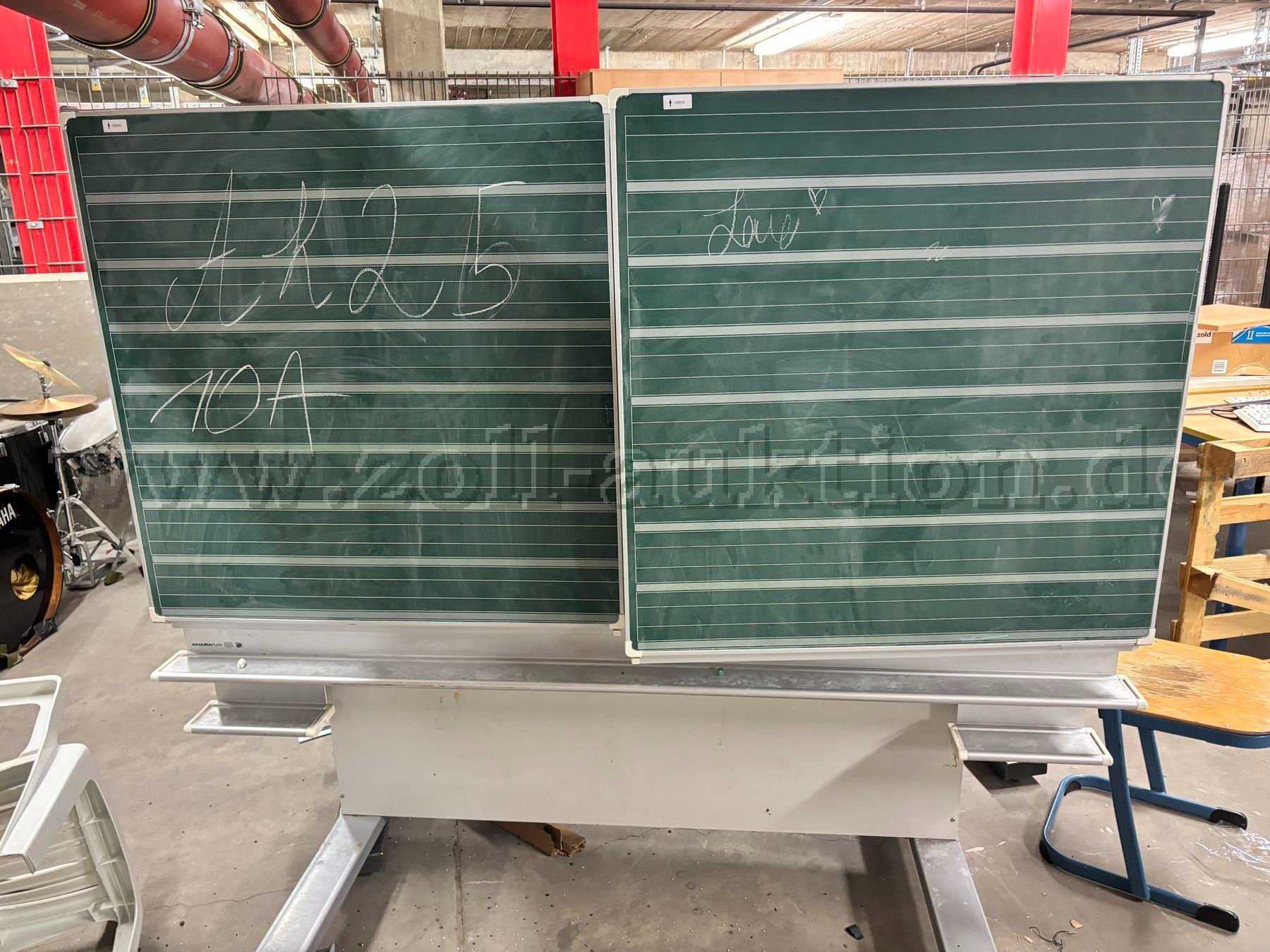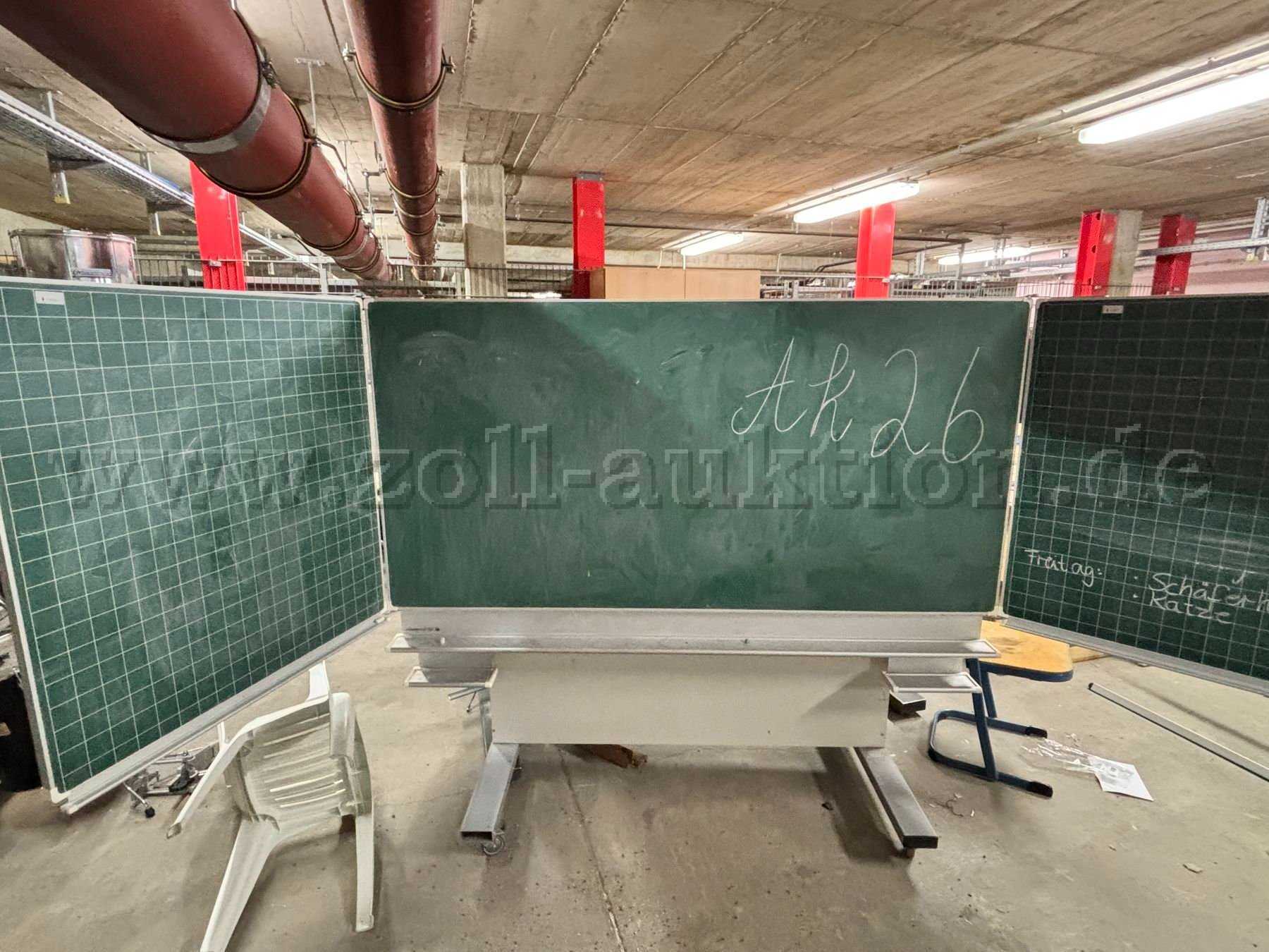 Auszugsweise Beschreibung: Hersteller von hier nicht mehr feststellbar, Beschaffung erfolgte vor 1993. CE-Kennung ist altersbedingt noch nicht vorhanden. Farbe Metallteile: hellgrau. Maße: Mitteltafel = 1 x 2 Meter (unliniert), 2x Außenflügel je 1 x 1 Meter (klappbar / innen mit Rechenkästen, außen mit Schreiblinien versehen); Höhe bei niedrigster Einstellung ca .1,75 Meter / maximal ca.2,30 Meter / Frontfarbe: grün. Vollständige Aluminiumrahmung. Gestell samt Kreideablage und Tafelschwammfach auf Aluminium. Unterhalb der tragenden Metallschienen sind jeweils 2 fixierbare Drehrollen angebracht, sodass bestmögliche Mobilität gegeben ist. Eine ansonsten turnusmäßige Sicherheitsprüfung wurde lagerungsbedingt seit mindestens 2010 nicht mehr durchgeführt. Leichte Verstaubung bzw. Reste von Tafelkreide sowie geringe partielle Verschürfungen an der Rahmenoberfläche sind augenscheinlich.