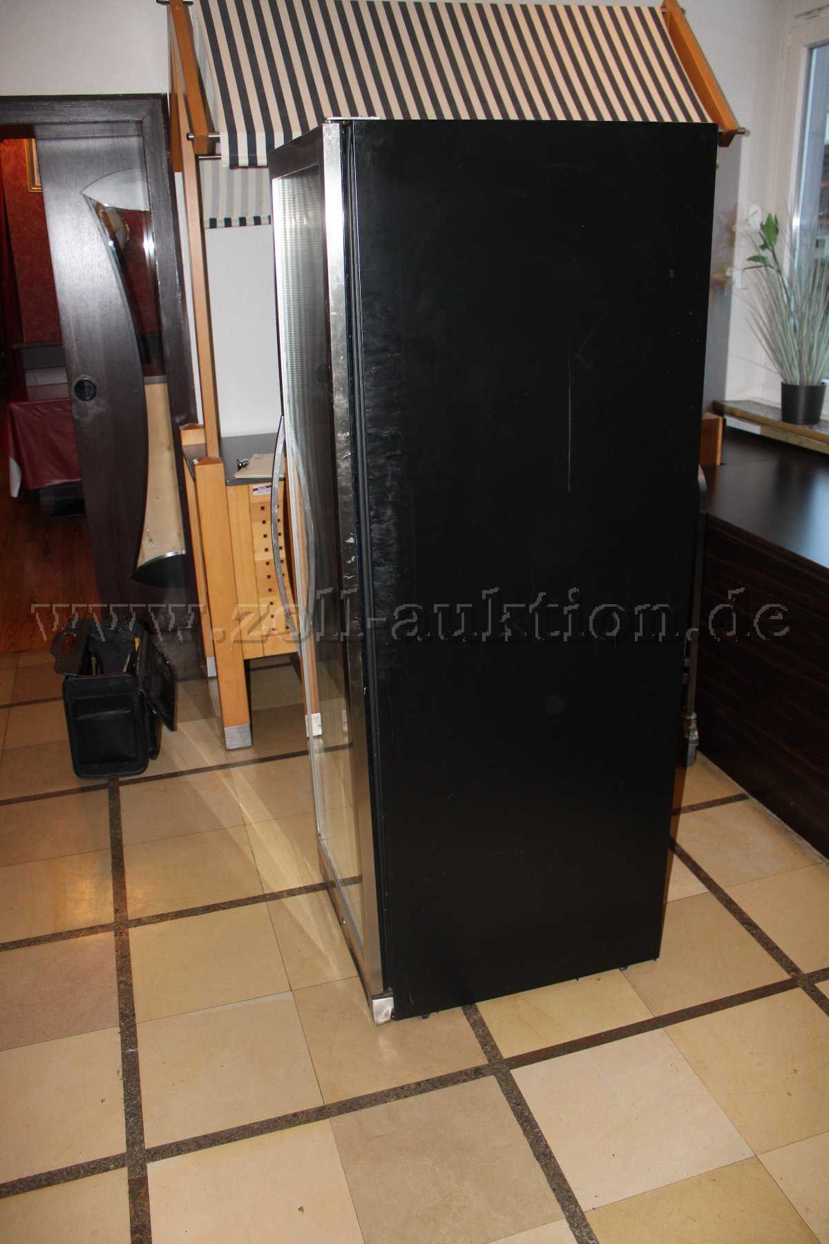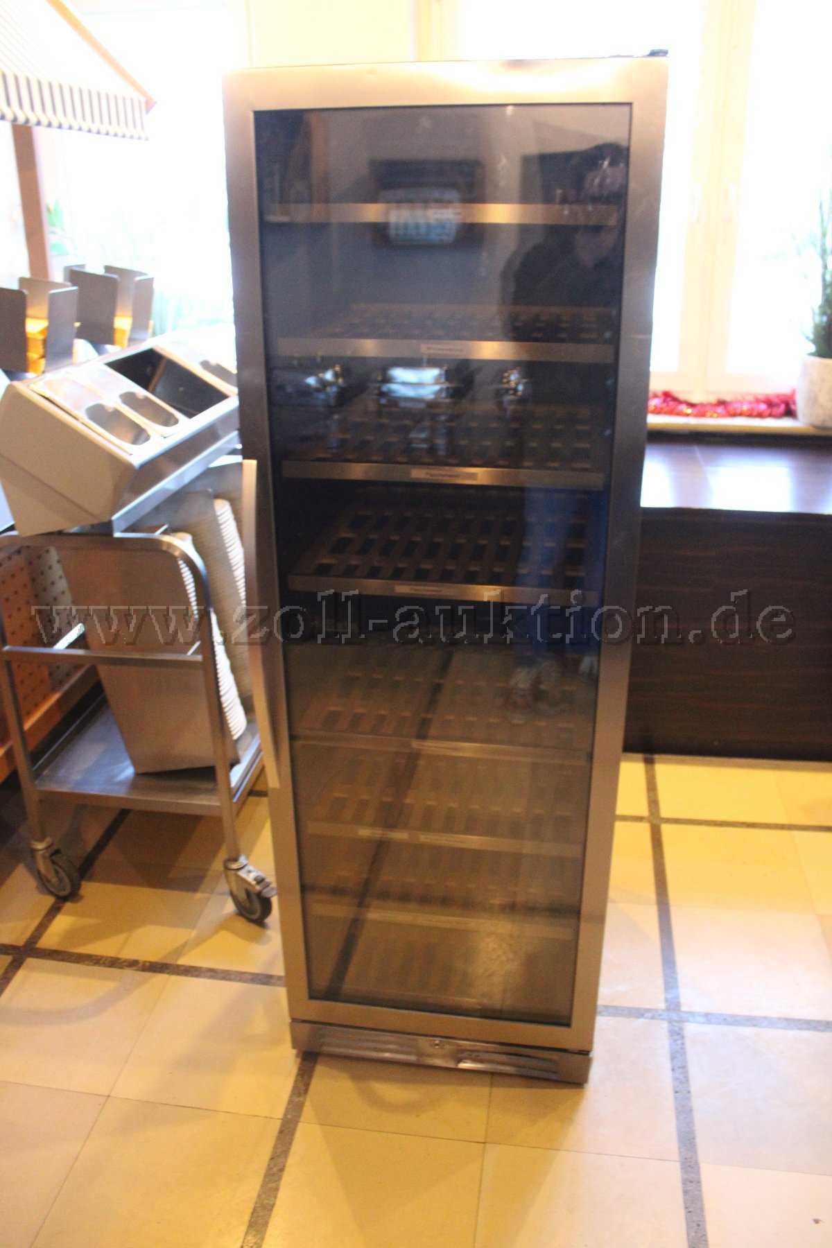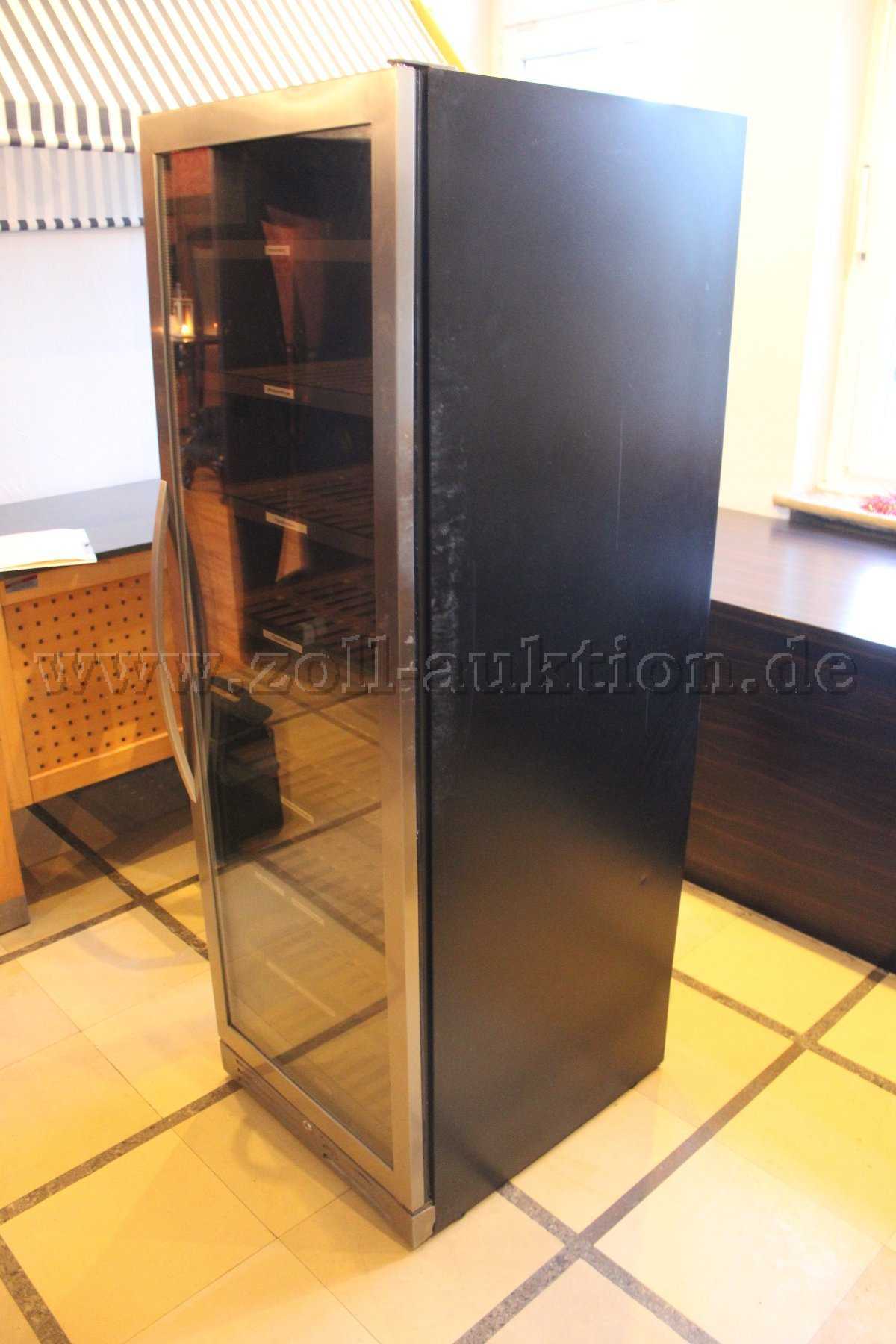 Der Weinkühlschrank ist in einem gebrauchten Zustand und weist Gebrauchsspuren in Form von Staub, Schmutz und Kratzern auf den Oberflächen auf.