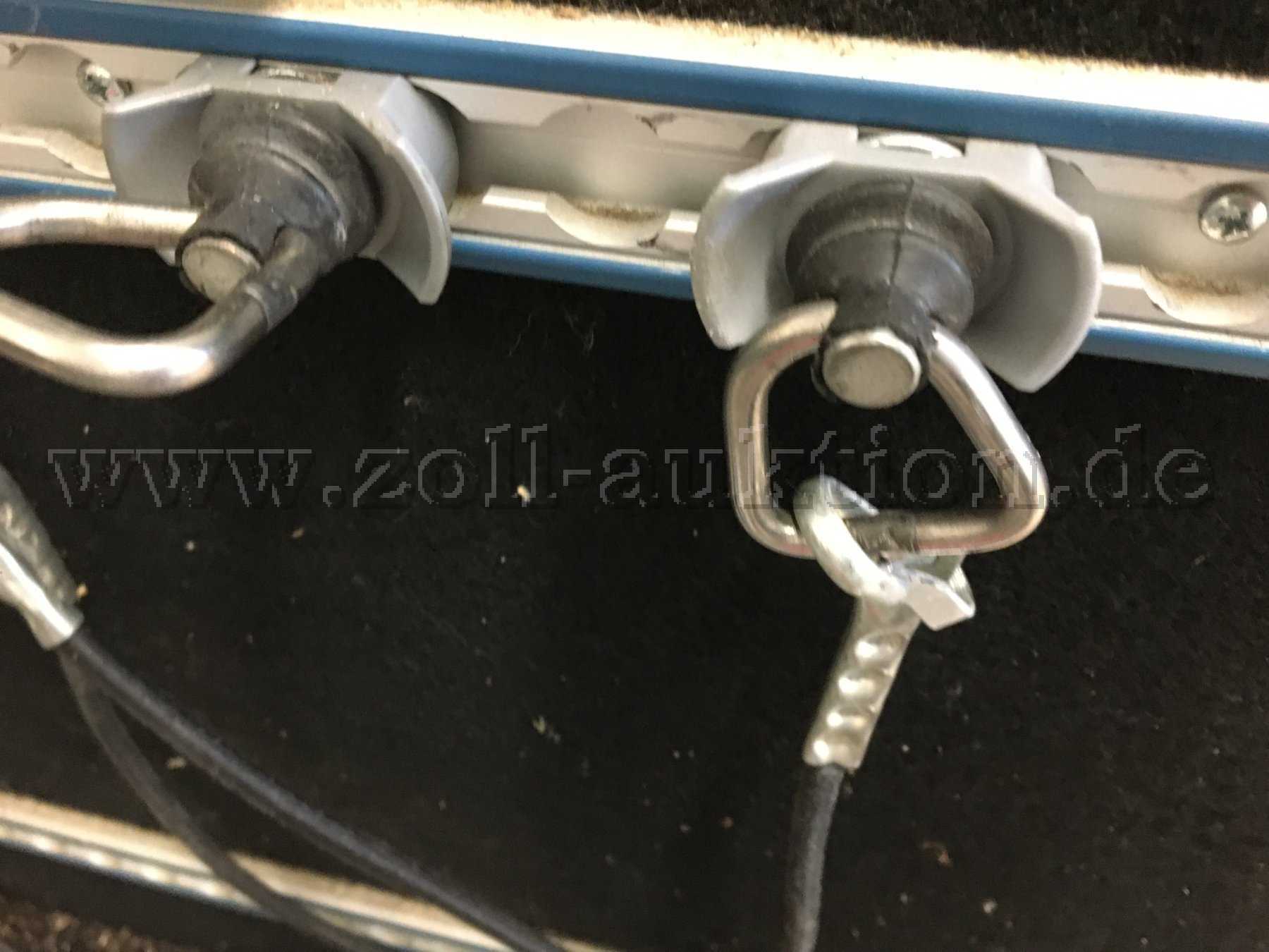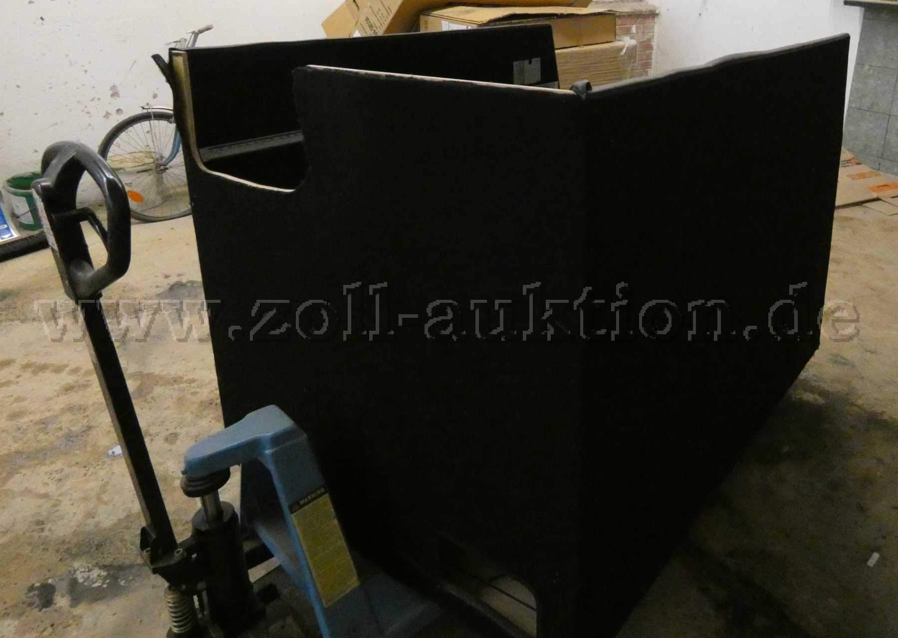 In den Kasten wurde gesägt, es befindet sich ein großes Loch in der Rückwand zum Sitzbereich des Fahrzeuges und ein Loch zum Schiebersystem, aus dem Boden heraus. Dort ist die Spanplatte und der Filz komplett zerstört. Bei diesem Einbaukasten handelt es sich um einen gepfändeten Gegenstand. Zusätzlich zur Sägebeschädigung sind Gebrauchsspuren, wie Kratzer, Staub, Schmutz und Abnutzungen vorhanden.