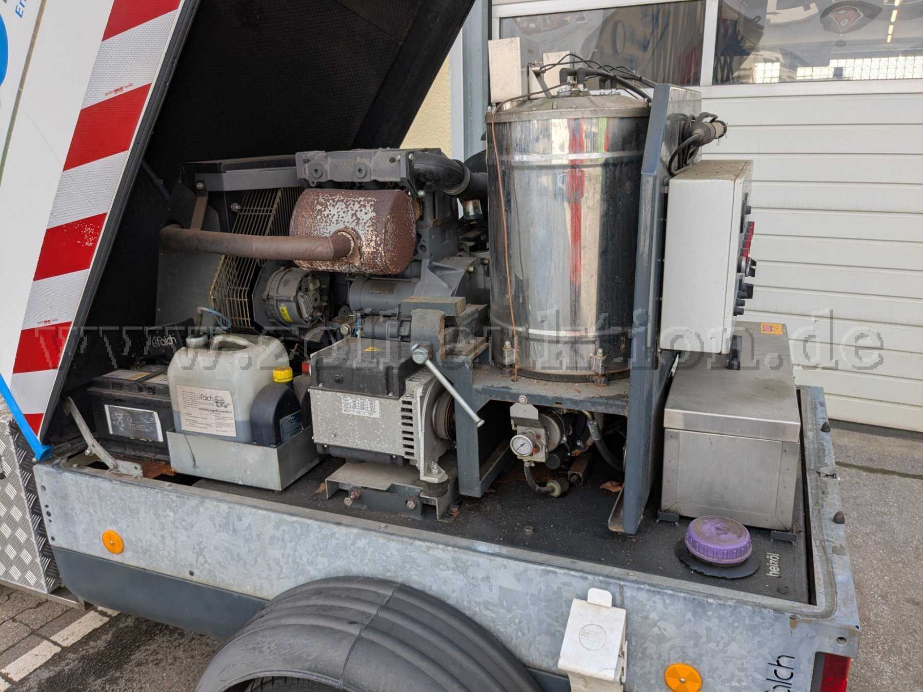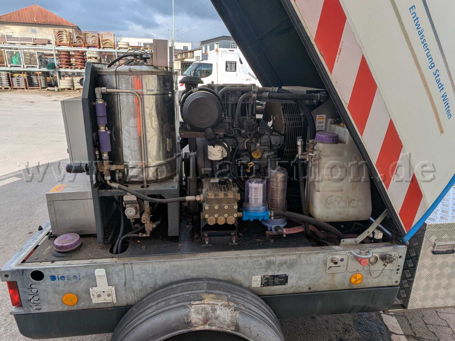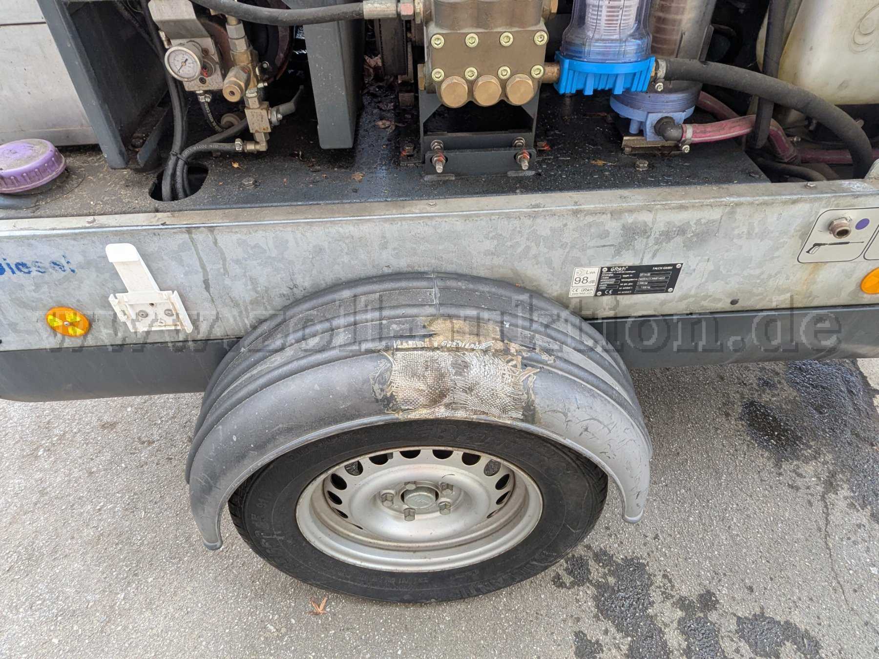 Versteigert wird eine Falch T3H Hochdruckheißwasserstrahlanlage montiert auf einem Einachsfahrgestell mit GFK-Haube.
