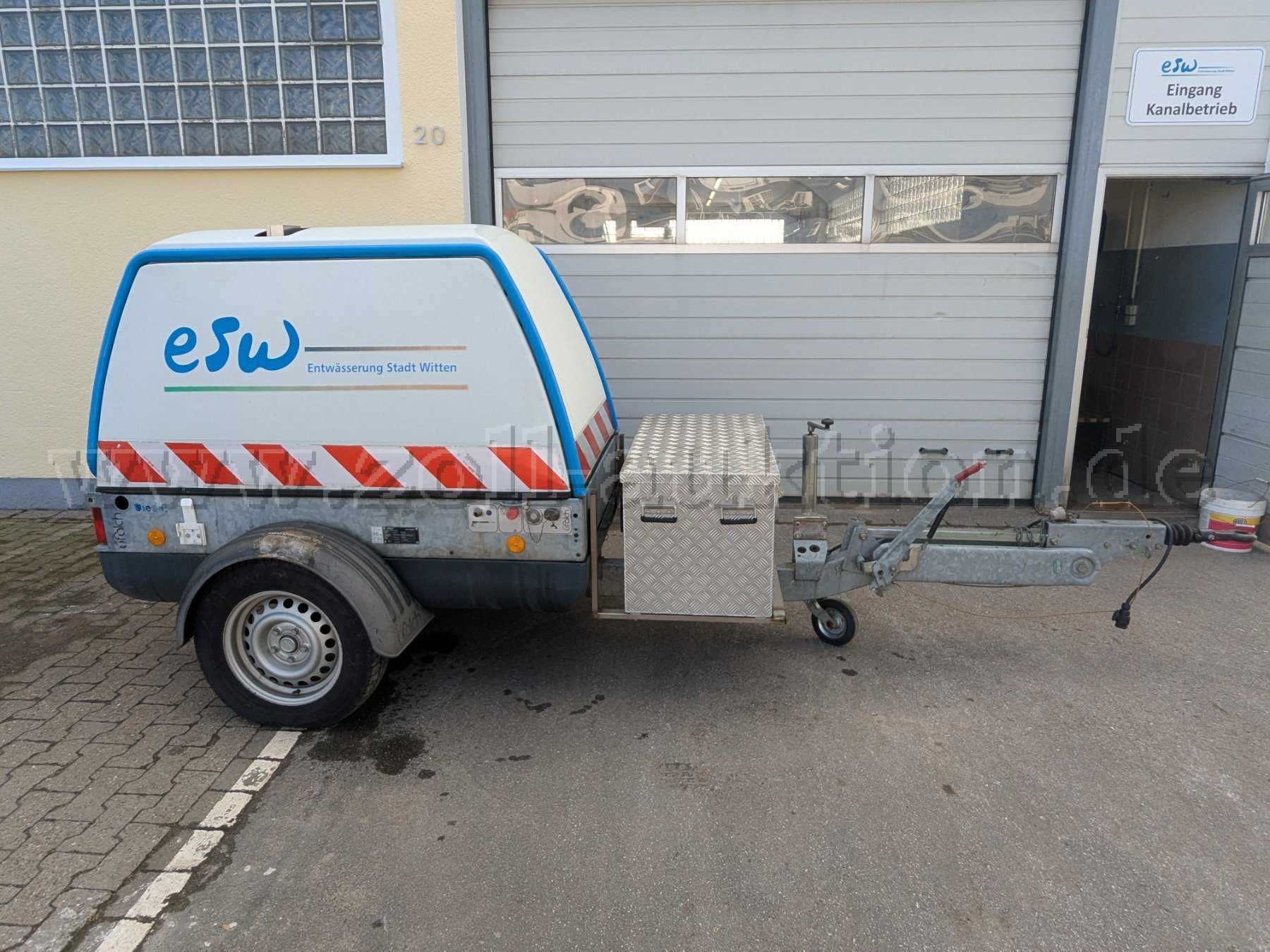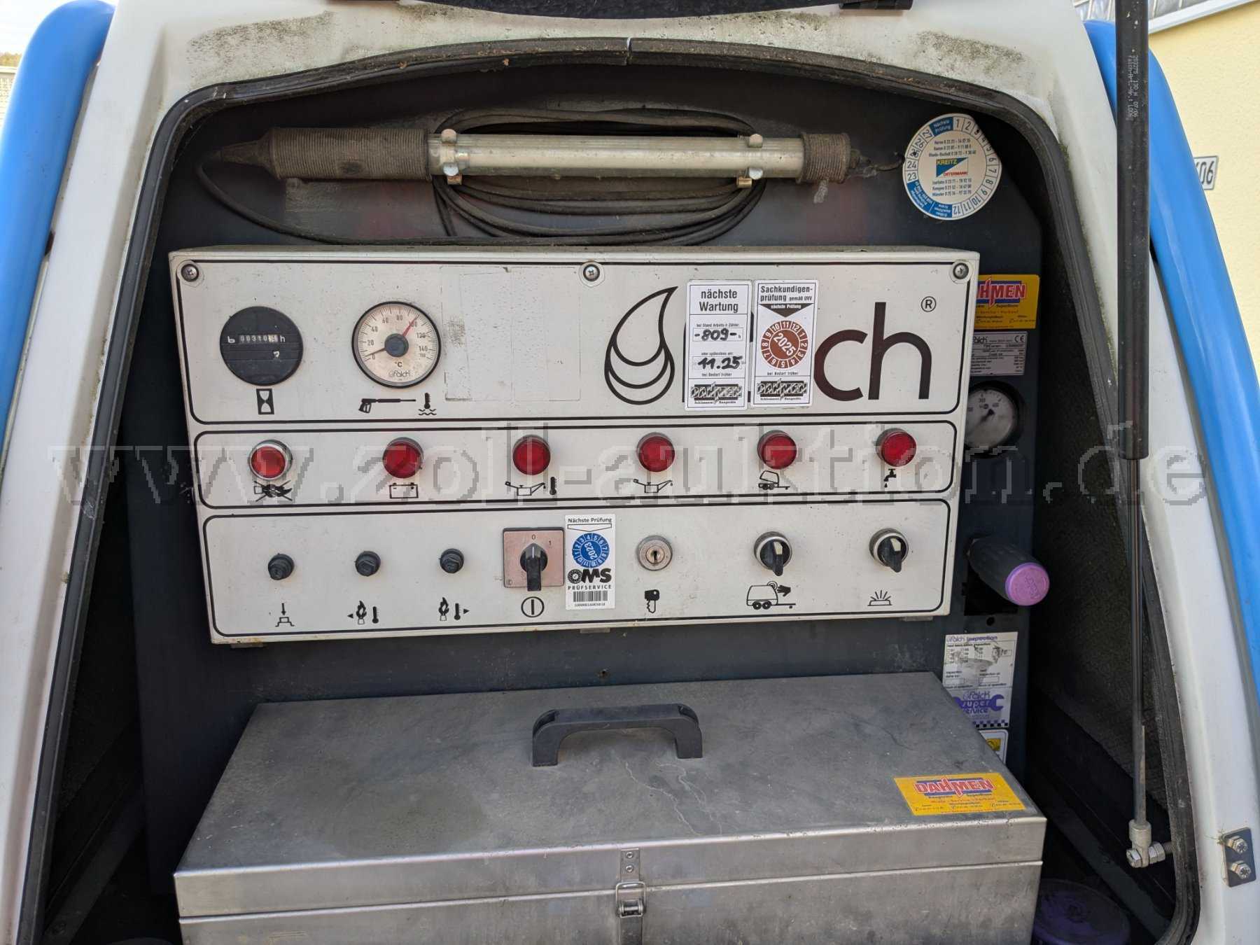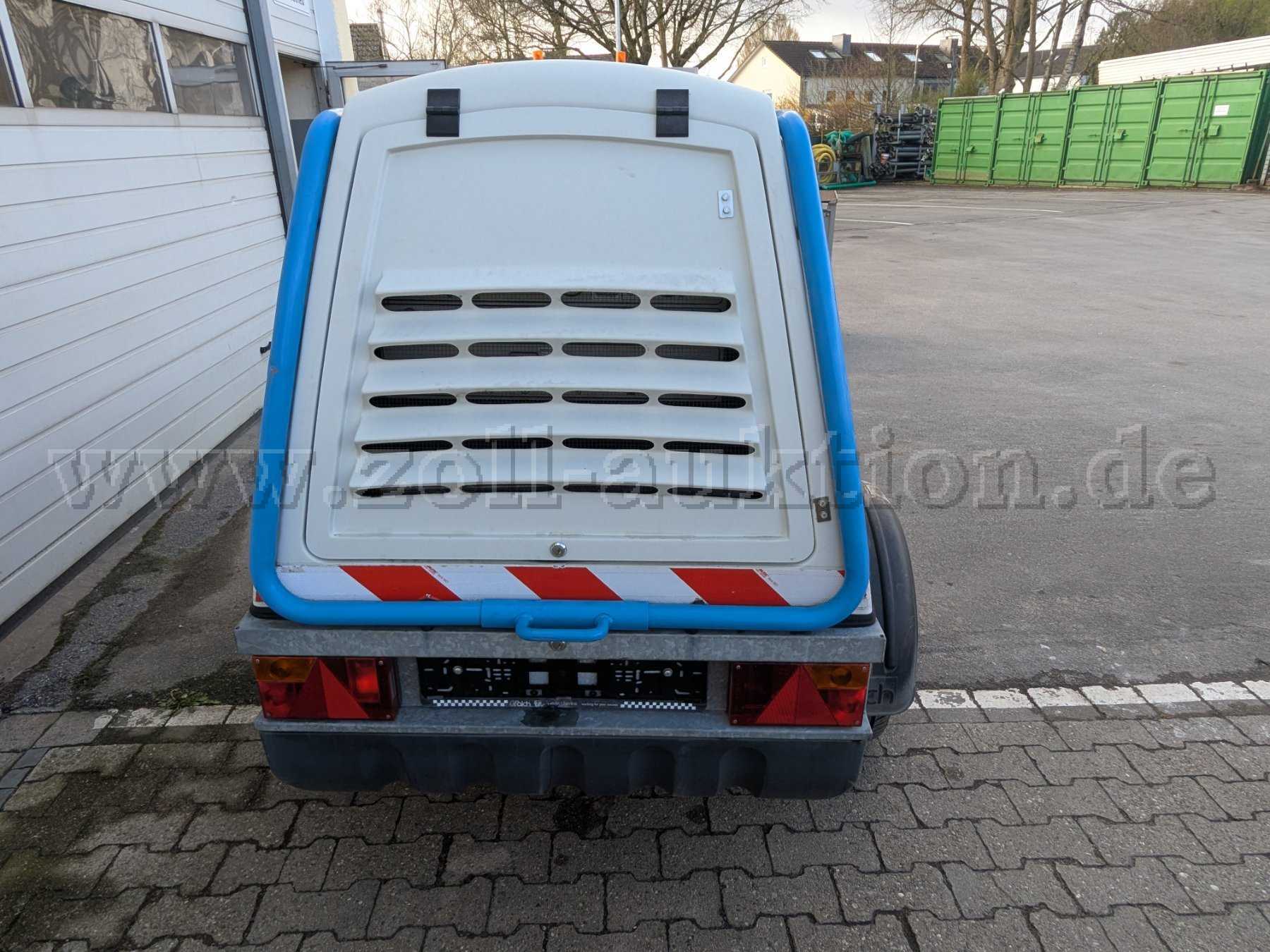 Versteigert wird eine Falch T3H Hochdruckheißwasserstrahlanlage montiert auf einem Einachsfahrgestell mit GFK-Haube.