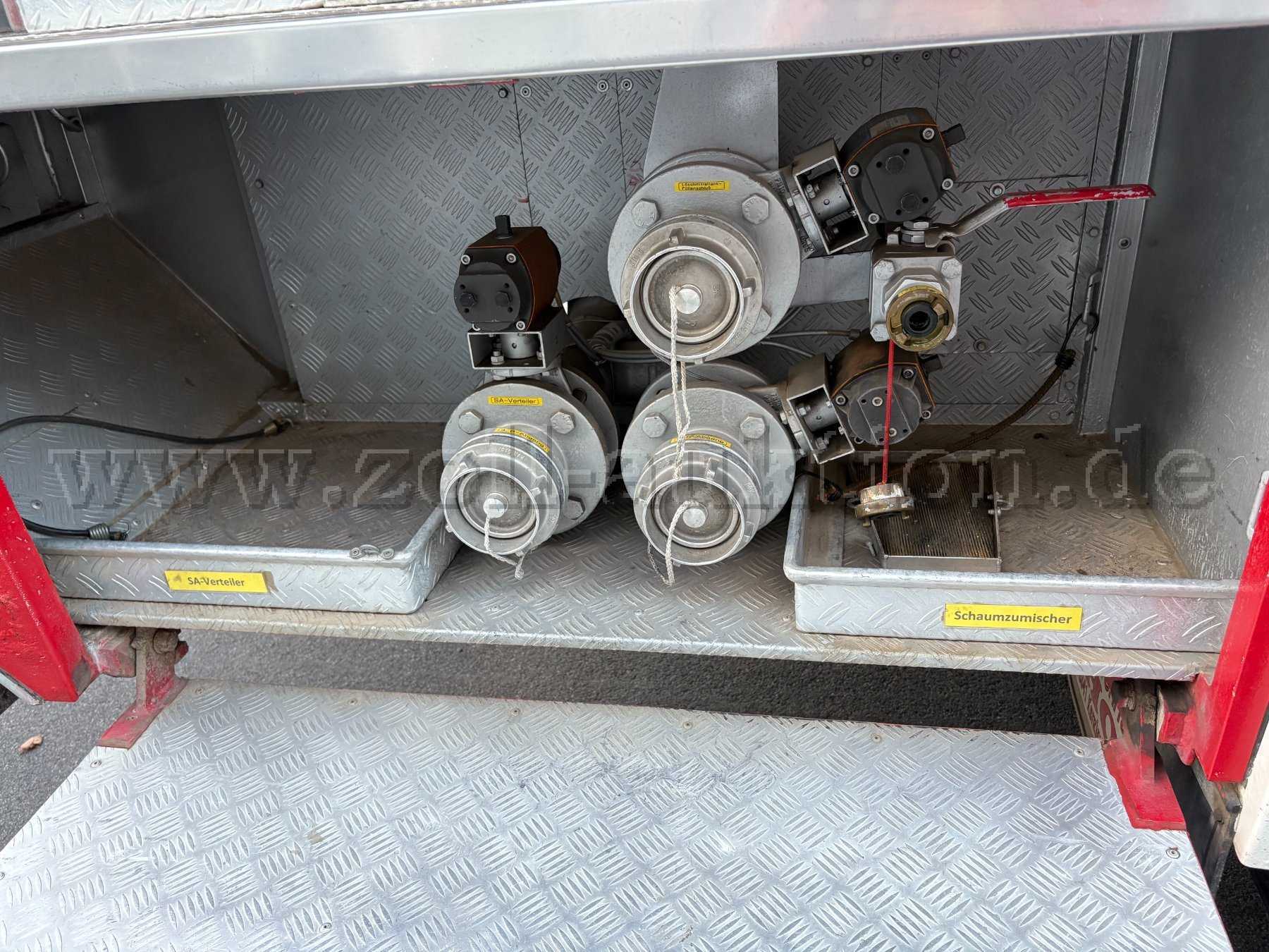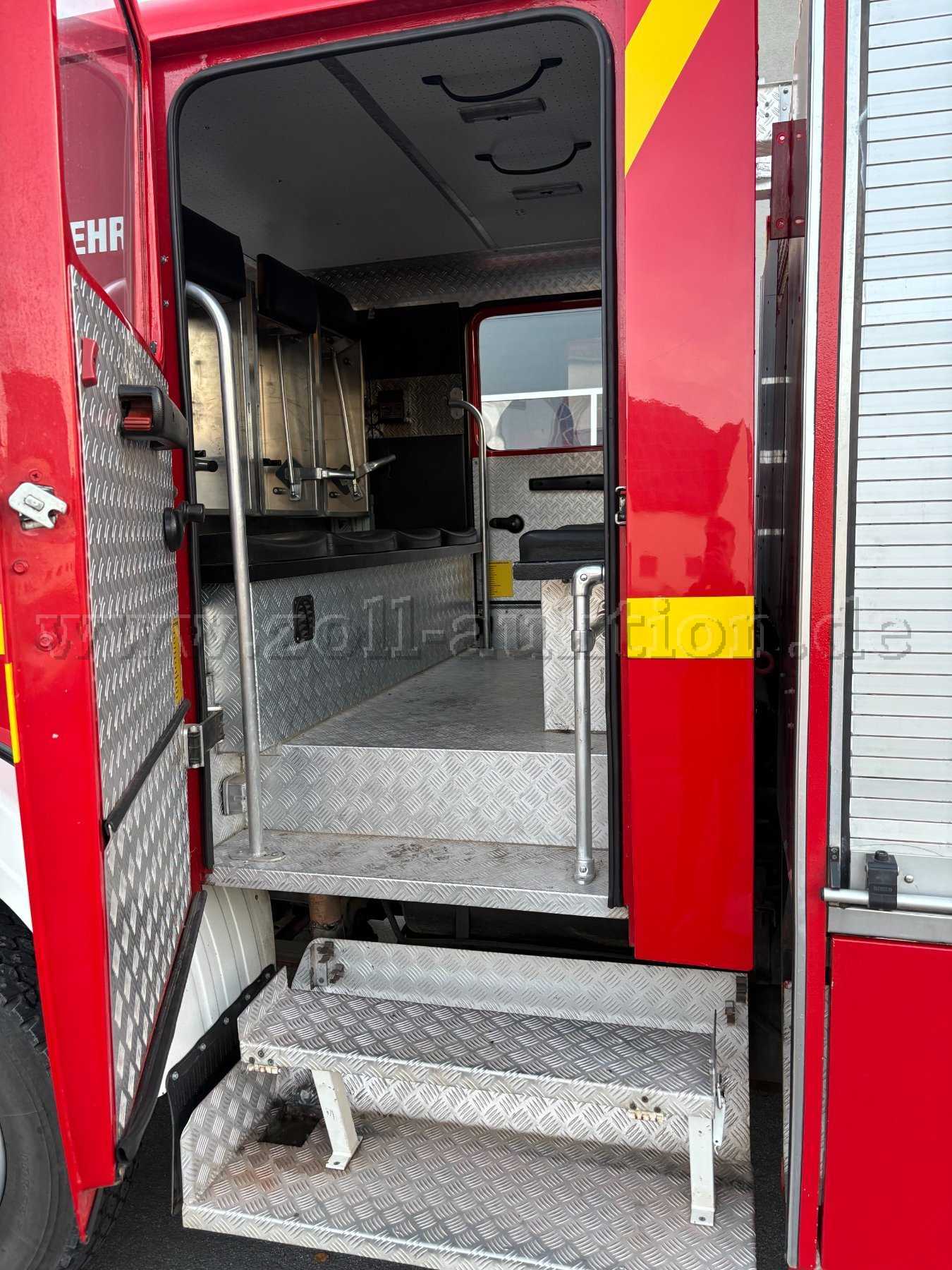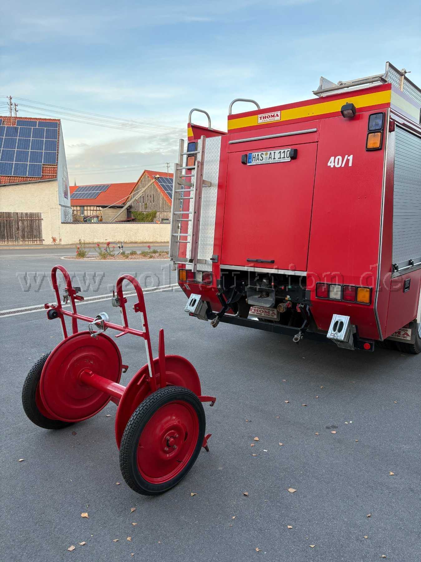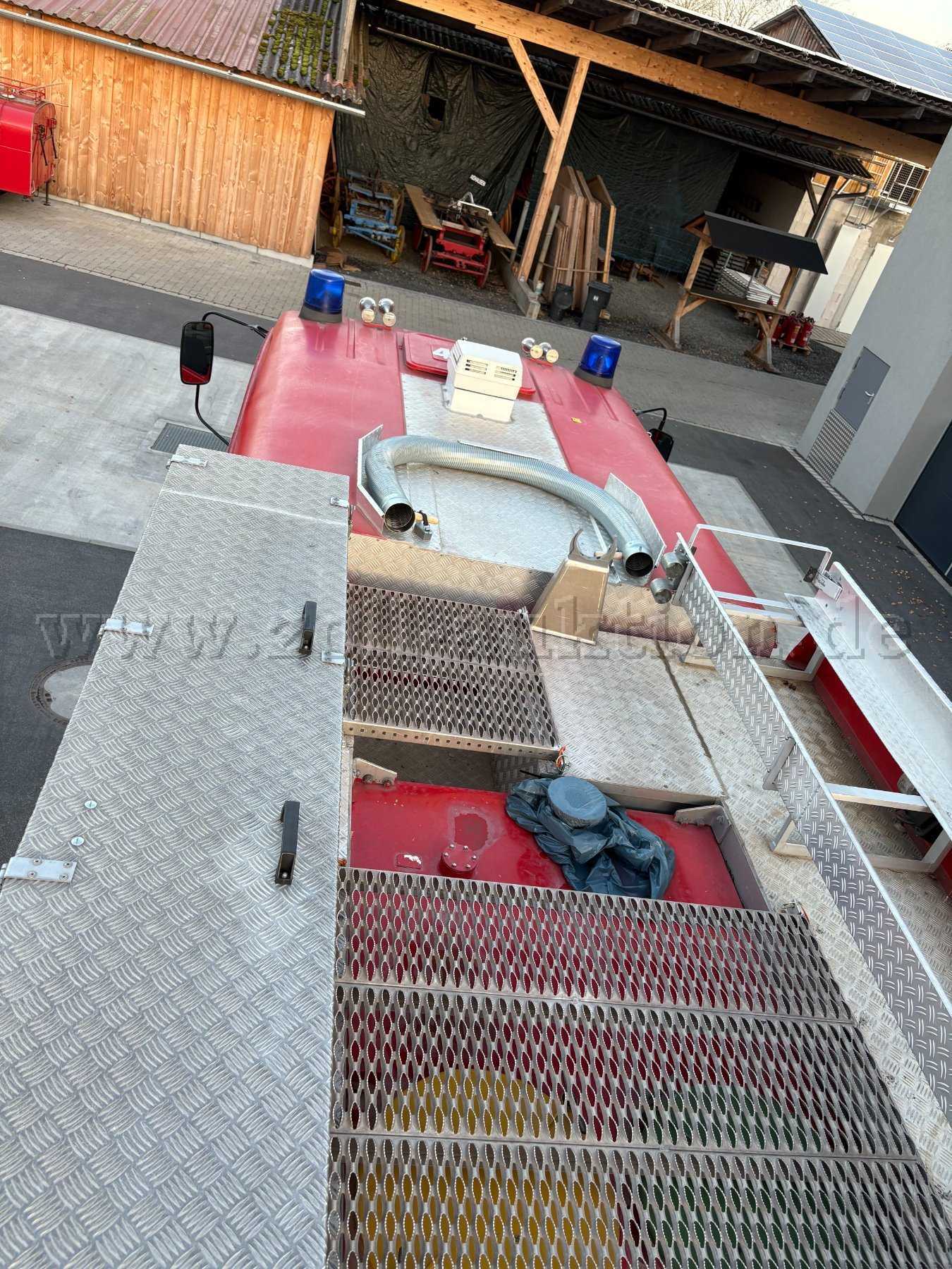 Weiteres Zubehör: Schnellangriffshaspel mit HD-Schlauch (60m), Schneeketten, Lichtmast pneumatisch mit 4x1000W-Scheinwerfer, 2-Mann-Haspel aufgeprotzt am Heck.