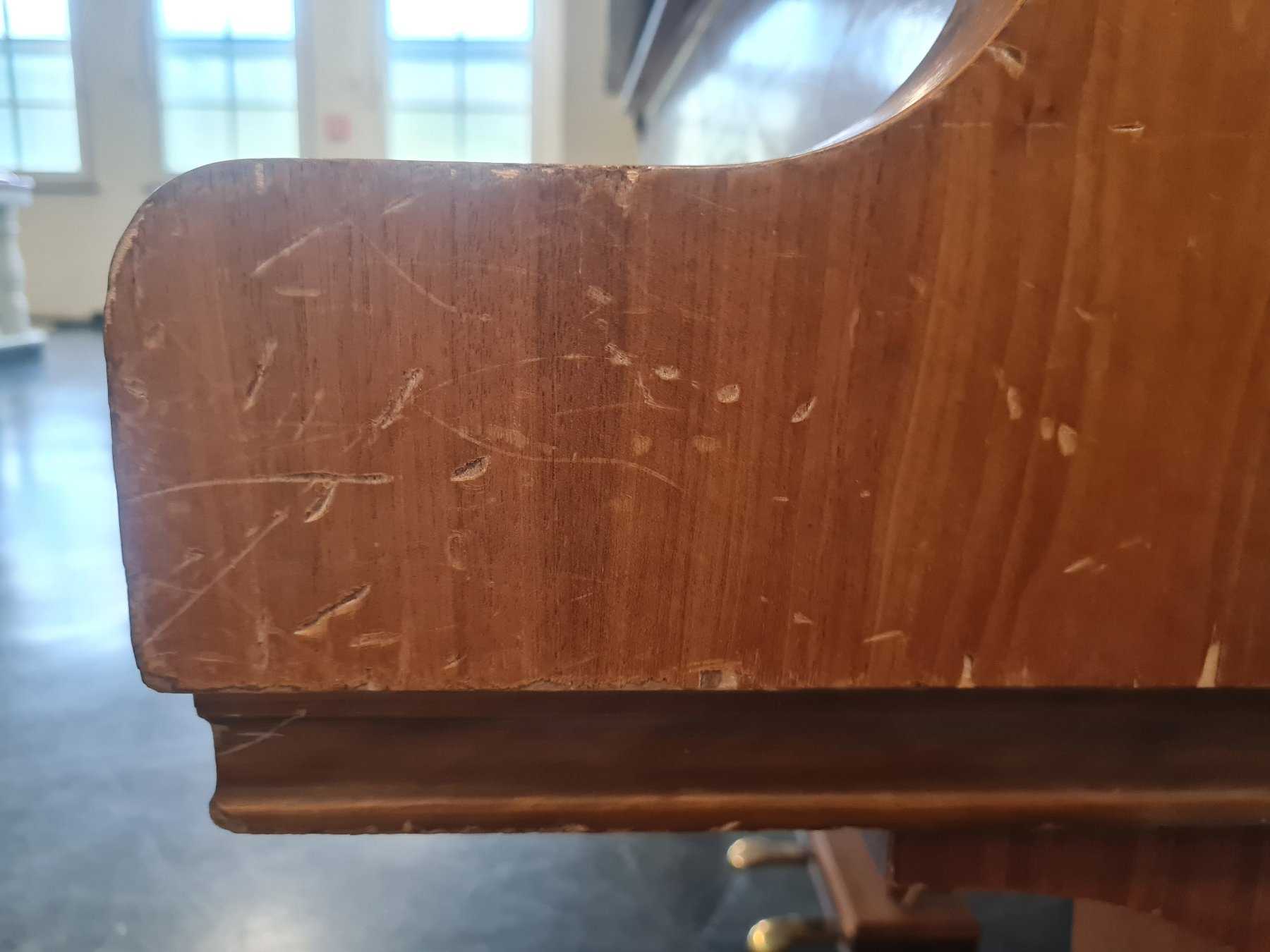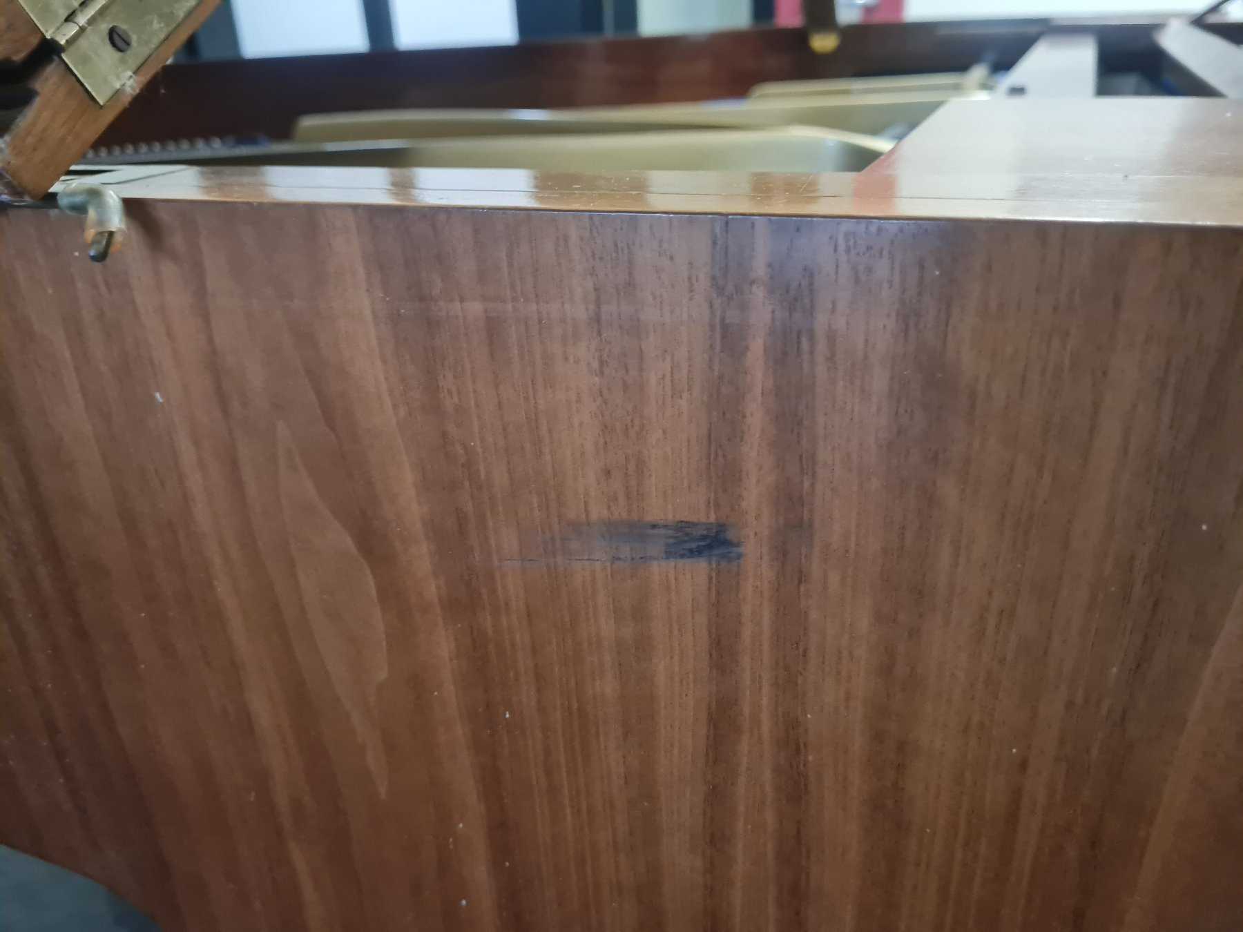 Das Instrument (Baujahr 1973) des deutschen Herstellers Seiler weist Lackkratzer, leichte Furnierschäden und Flecken auf. Die Funktionsfähigkeit ist durch die Schäden nicht beeinträchtigt.