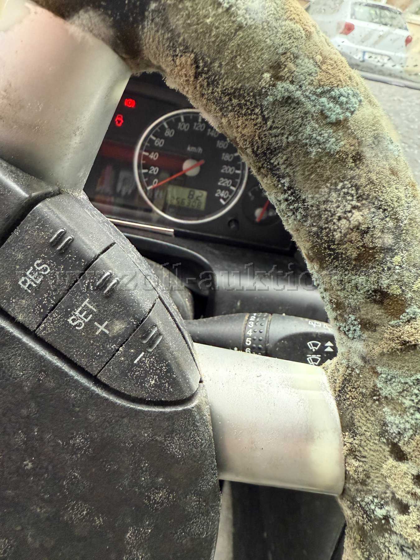 Verschiedene Eindellungen, Deformierungen, Verschürfungen sowie Kratzer, Roststellen und Steinschläge am Fahrzeuglack sind augenscheinlich. Im Innenraum ist ein sehr starker Schimmelbefall und eine starke Verschmutzung feststellbar.