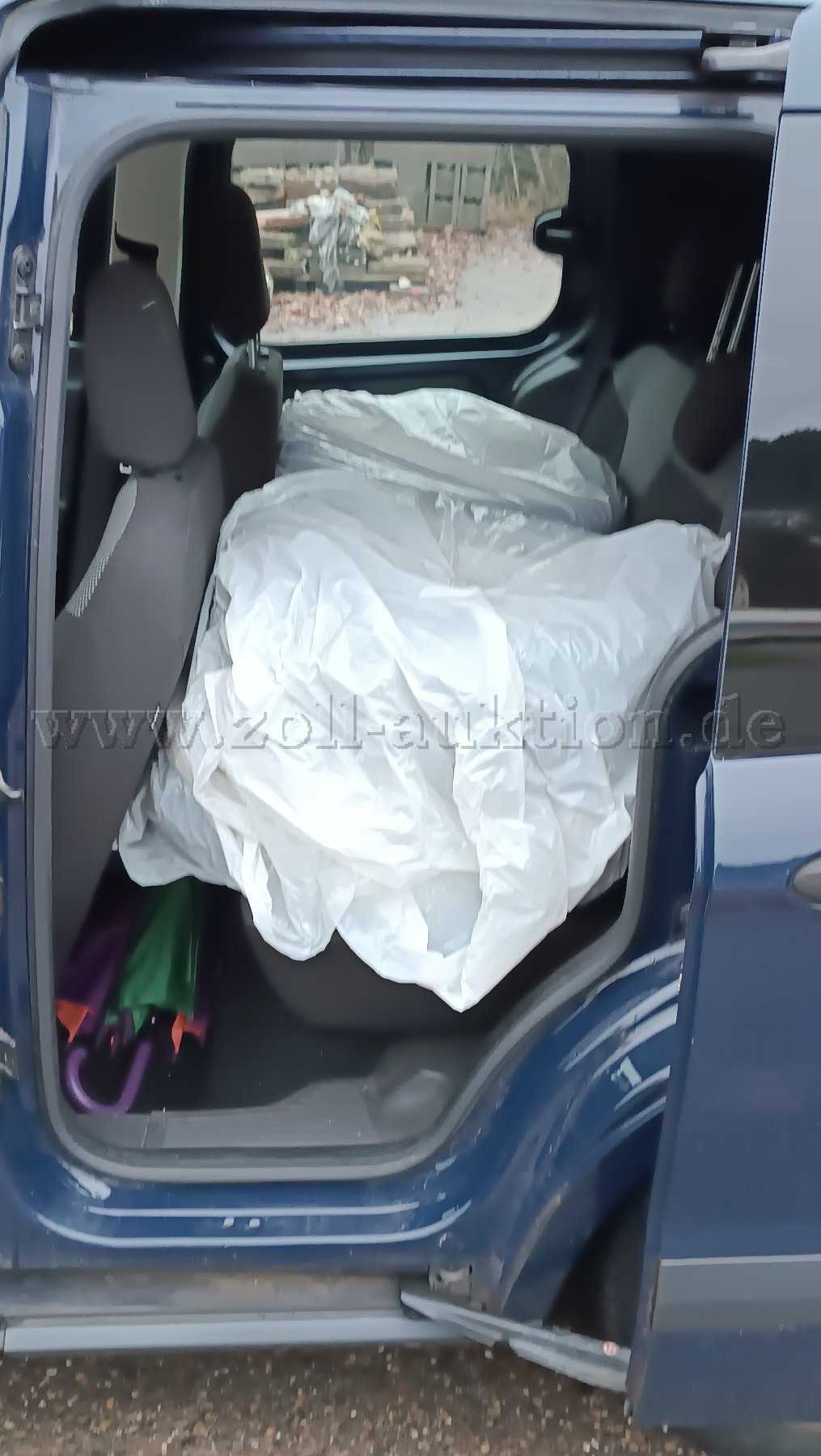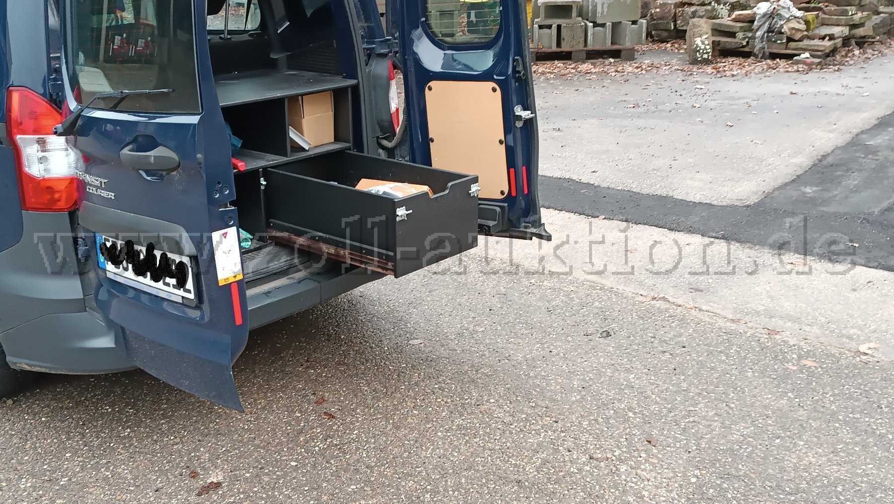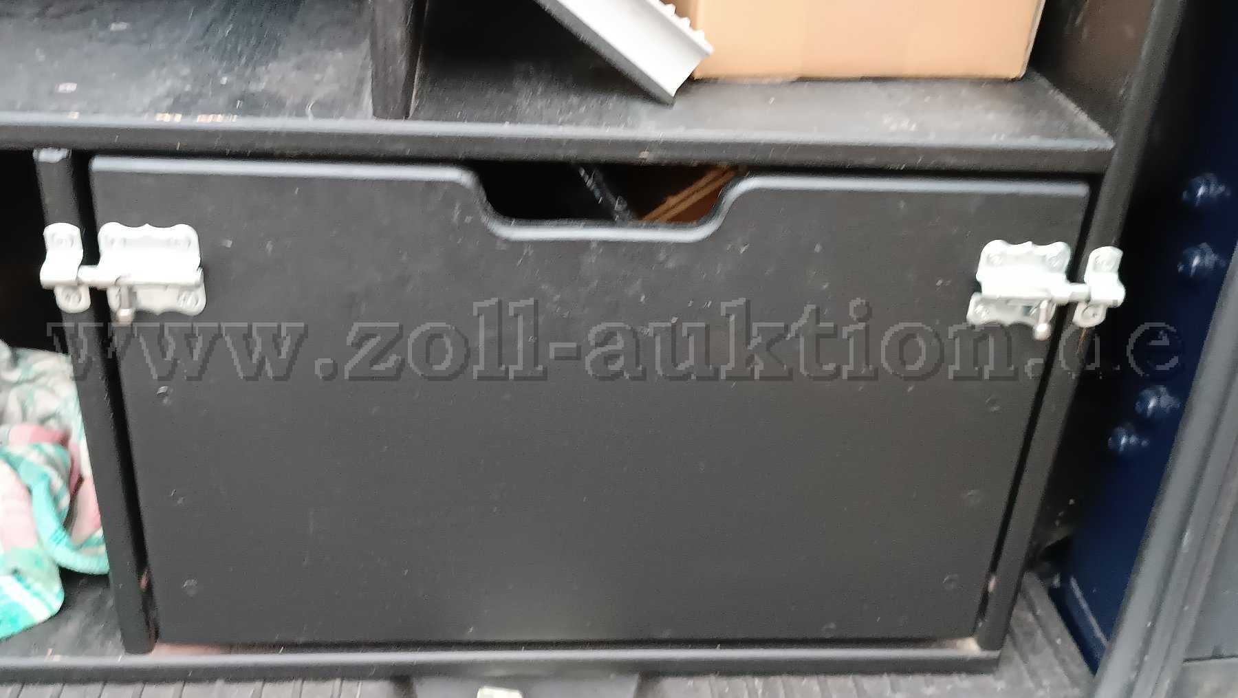 Im Kofferraum befindet sich ein vom Schreiner eingepasstes Holzregal mit großer Schublade. Dieses kann einfach herausgenommen werden, da es nicht fest mit dem Fahrzeug verbunden ist. Das Holzregal ist Bestandteil der Auktion.