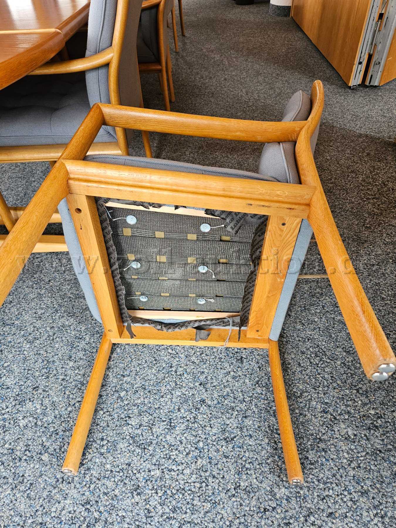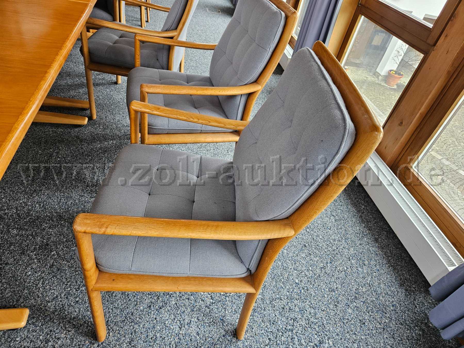 Auf den Stühlen sind vereinzelt Flecken auf den Sitzpolstern sowie Kratzer und Abnutzungen an den Armlehnen.