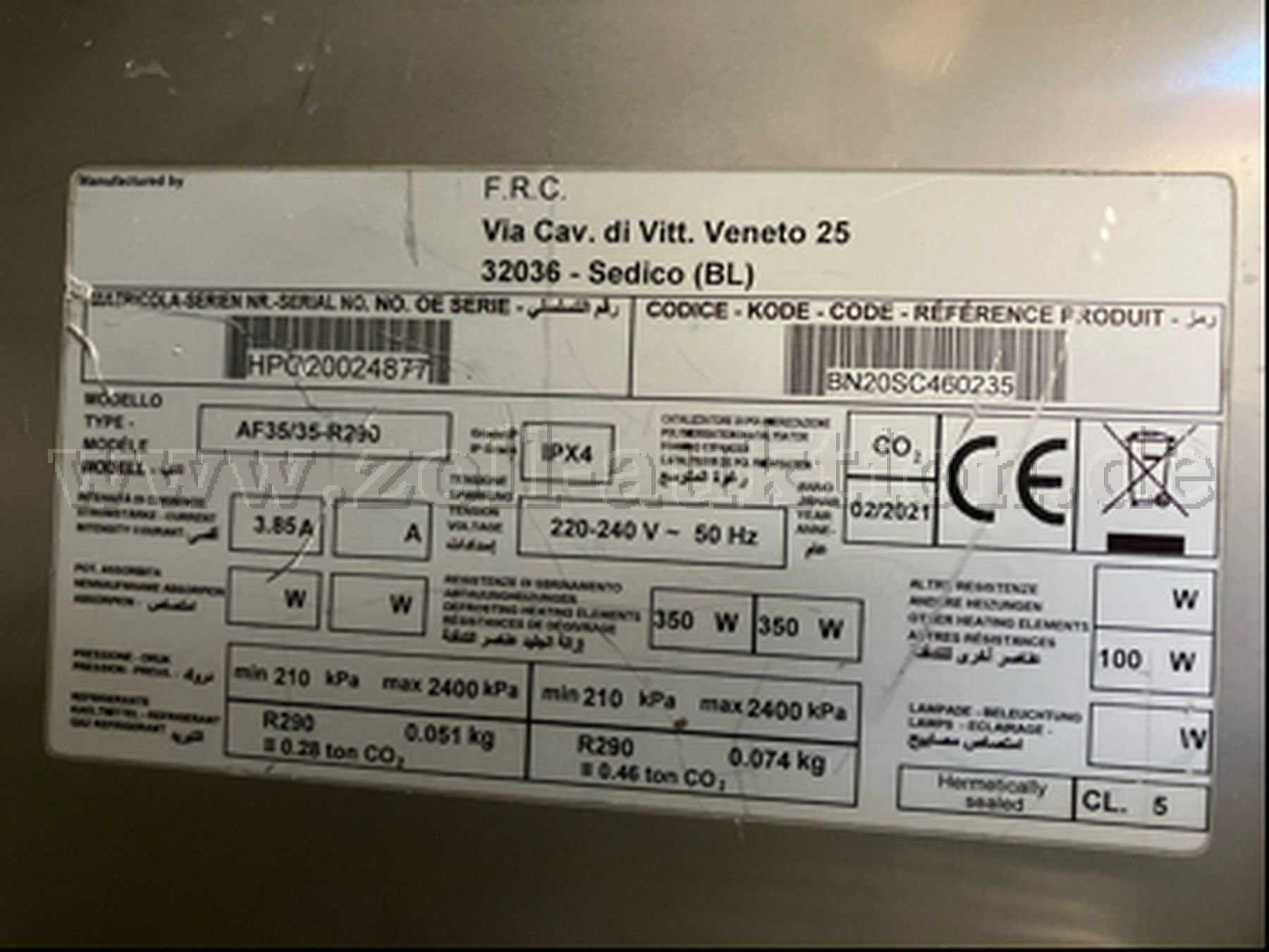 Auszugsweise Beschreibung: Hersteller/Vertrieb: F.R.C.- friulino - Modell/Type: AF35/35-R290 mit insgesamt 3 Ablagegitter. Leistung: 100W, 3,85A, 220-240V, 50 Hz. Front- und Seitendekor: Aluminium, matt – teilweise gebürstet. Maße ca. (HxBxT) = 205x68x83 cm / Lt. Herstellerlabel (s. Foto) aus 02/2021. Die untere Türfront weist drei kleiner Eindellungen auf, auf der oberen Tür sind nutzungs- und materialspezifisch diverse Griffspuren augenscheinlich. CE-Kennung vorhanden.