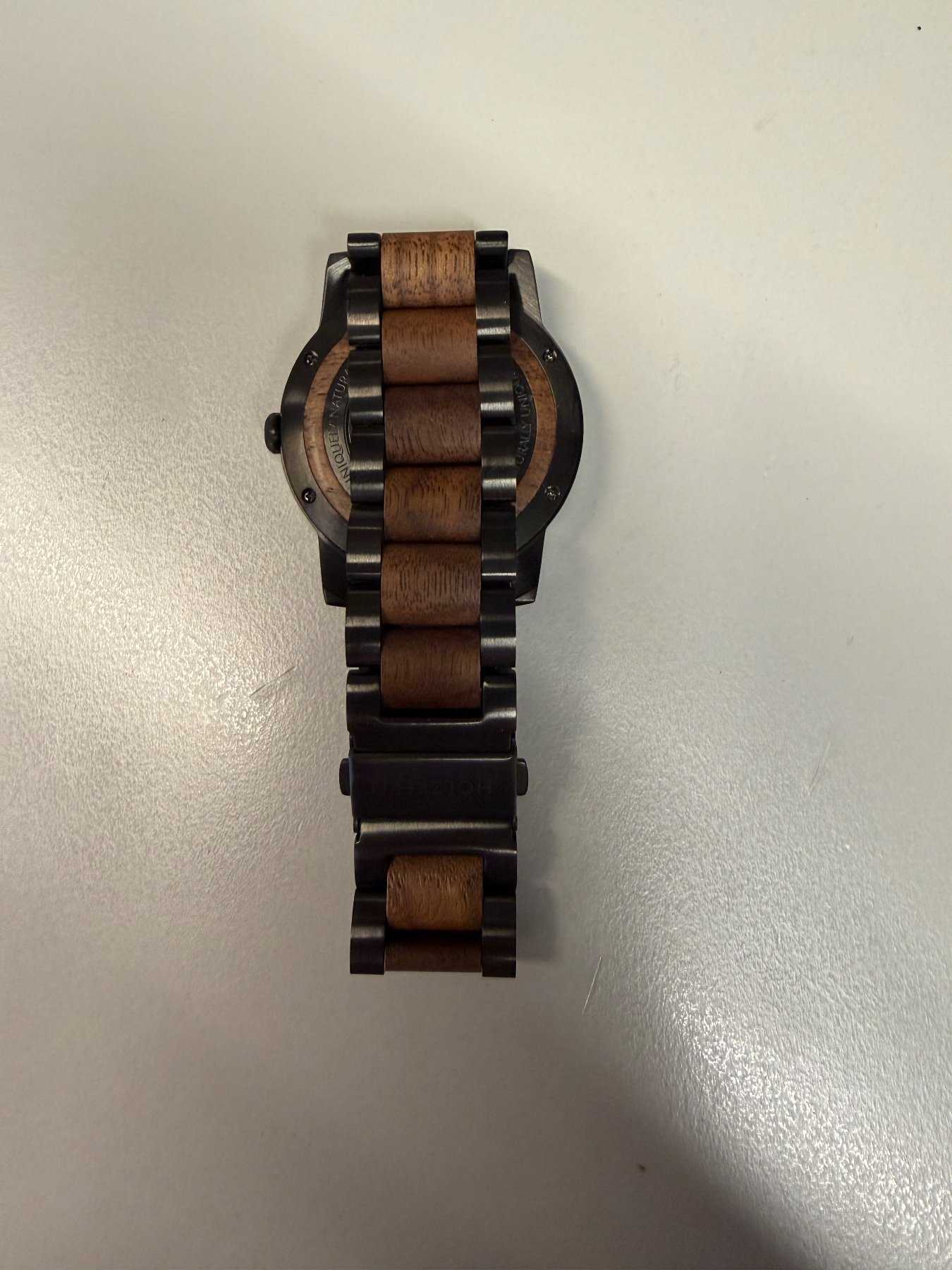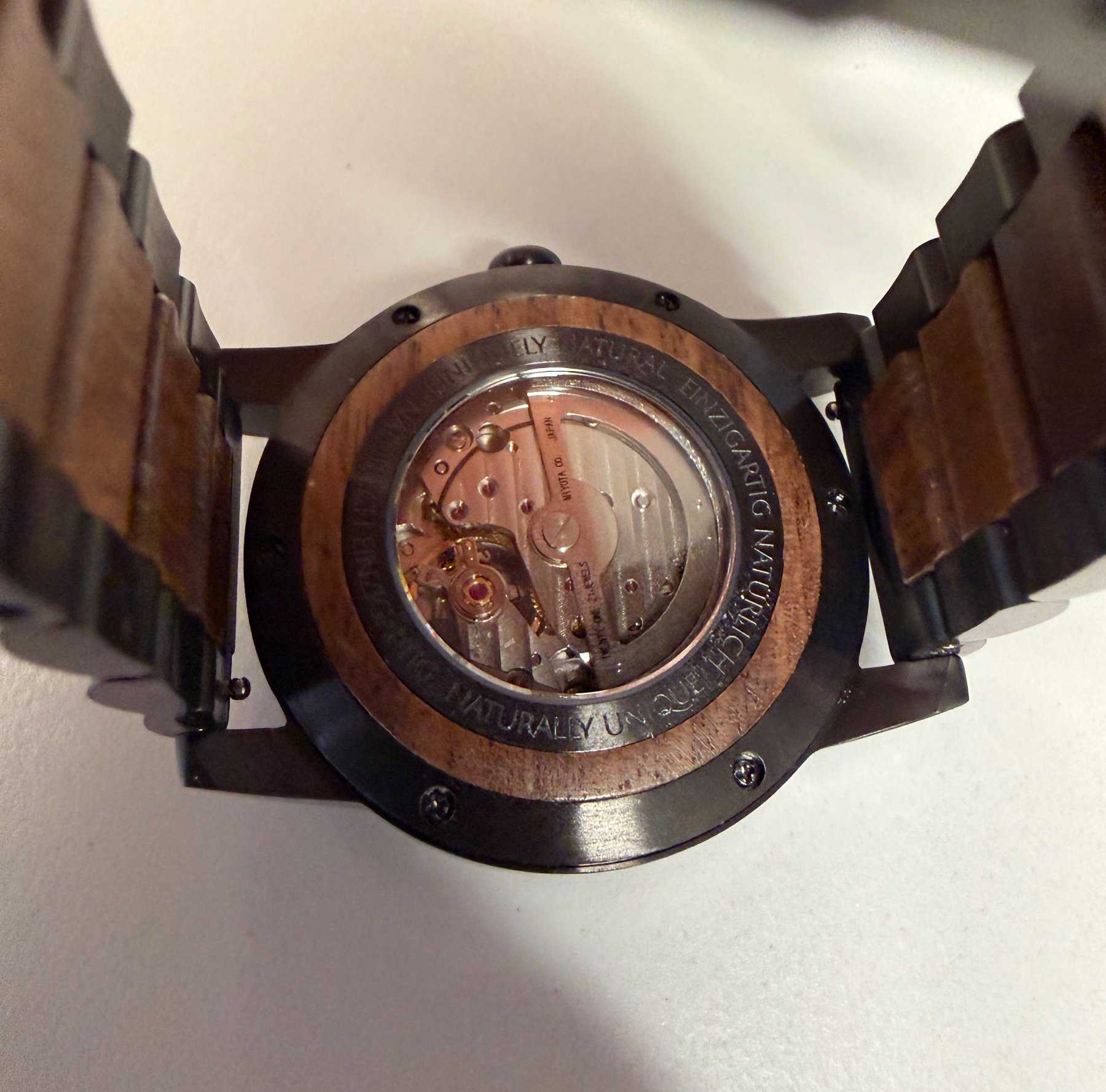 - Holzart unbekannt (Nach Aussage des Herstellers besteht die Uhr aus nachhaltiger Holzherstellung)