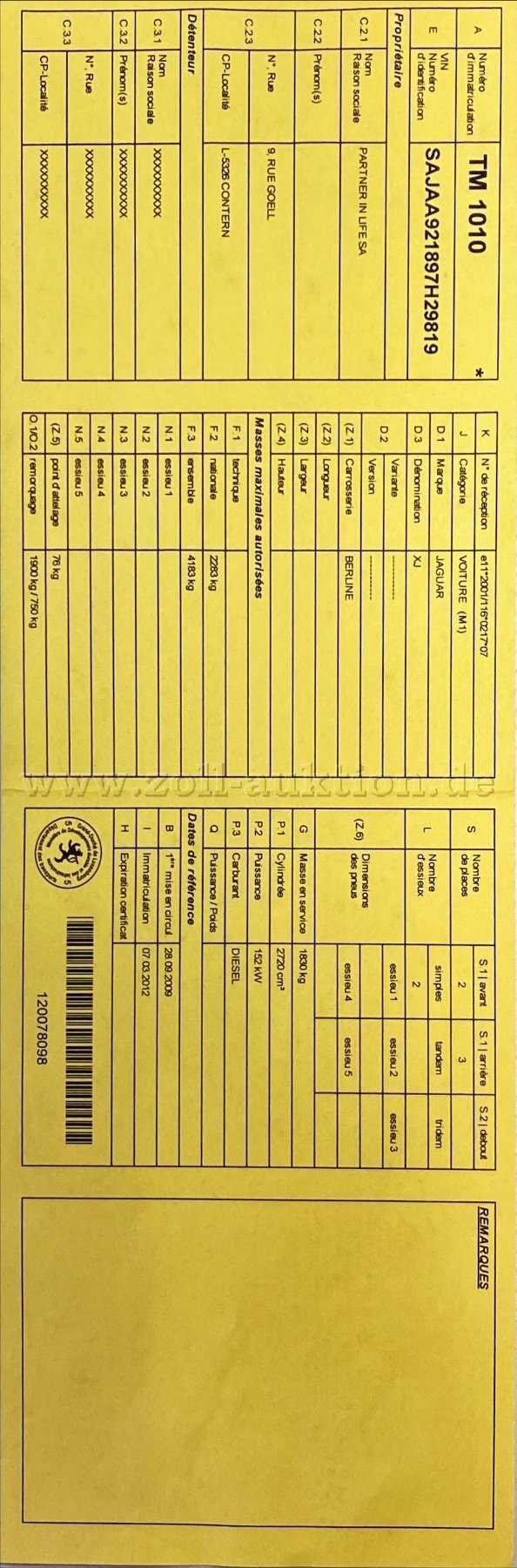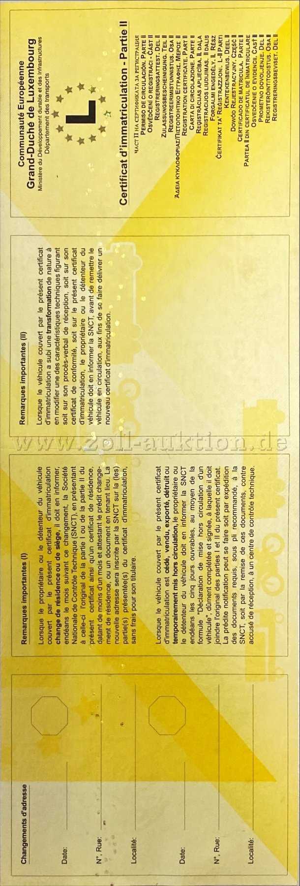 Eine Kopie der ehemaligen deutschen Zulassungsbescheinigung Teil II und eine Luxemburgische Zulassungsbescheinigung sind vorhanden. (Fotos)