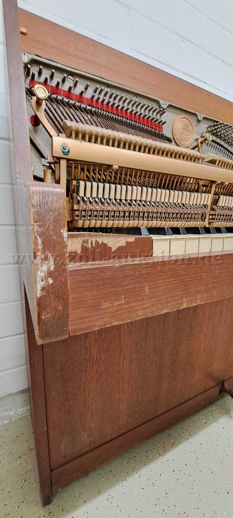 Das Instrument hat starke Gebrauchsspuren am Lack (Furnierschäden links und rechts der Klaviatur sowie beschädigter Dämpferfilz).