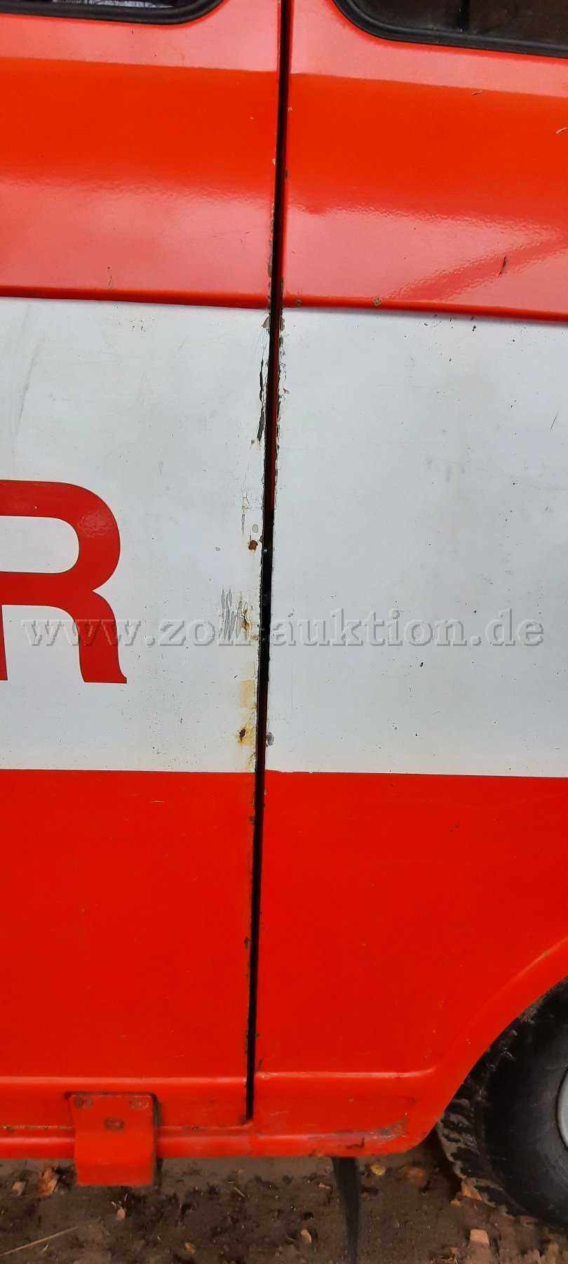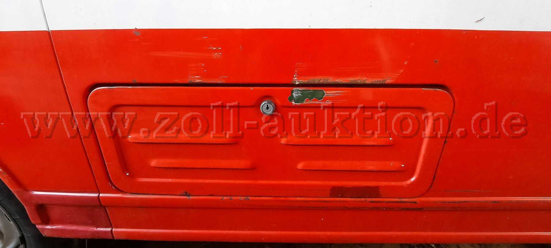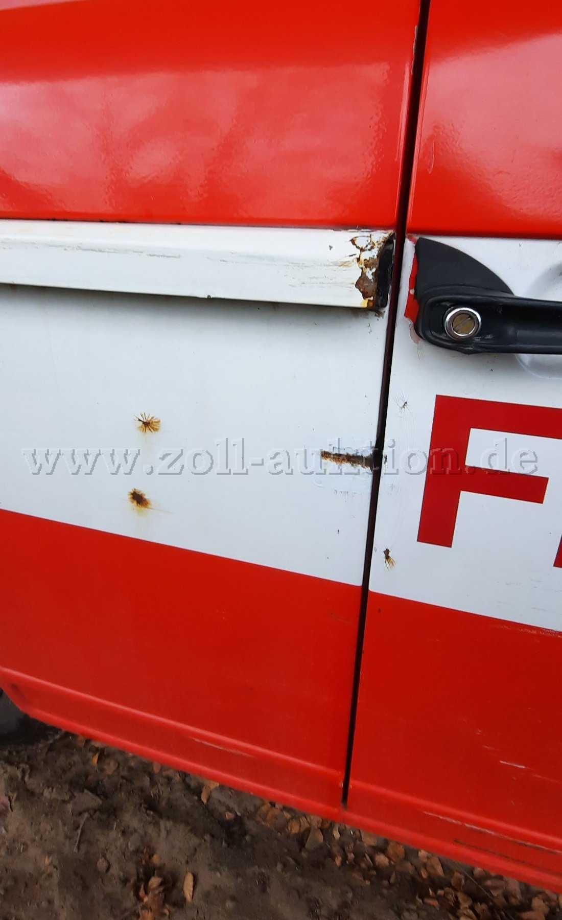 - kleinere Roststellen und Lackabplatzungen an der linken Fahrzeugseite (Seitenkasten), an der rechten Fahrzeugseite im Bereich der Türen, im Innenbereich auf dem Fahrzeugboden, im Heckbereich außen im Bereich des Türanschlags und der Stoßstange, im Heckbereich innen auf dem Fahrzeugboden