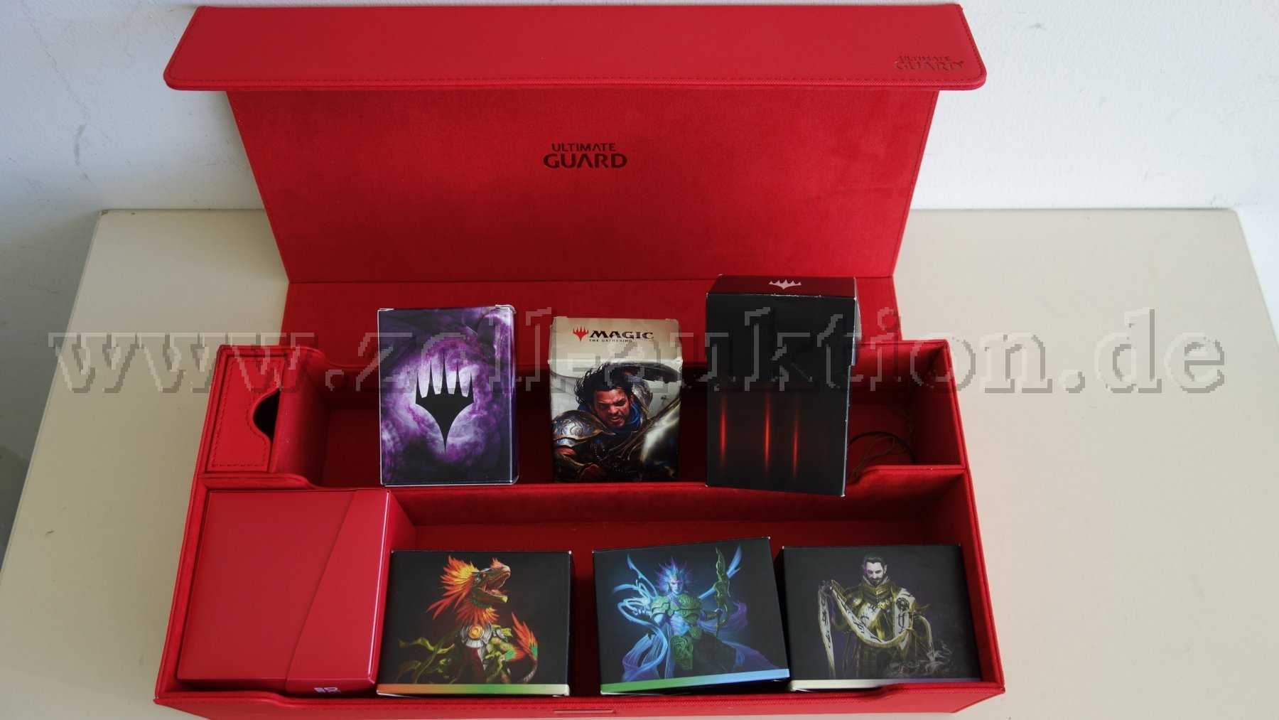 - 1 große rote Aufbewahrungsbox mit Aufschrift ULTIMATE GUARD mit folgendem Inhalt: 1 rote leere Box und 6 verschiedene Boxen mit ca. 574 Karten
