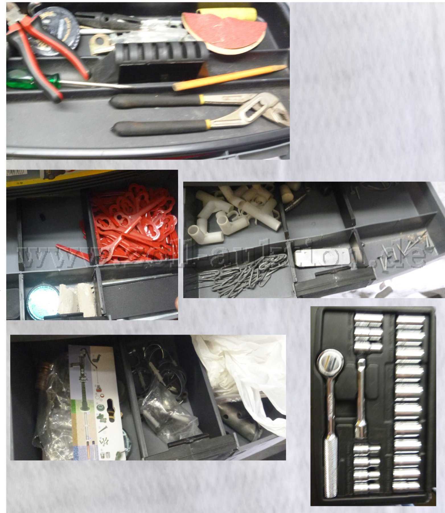 Alle Behältnisse und Werkzeuge weisen Gebrauchsspuren, Abnutzungen und Schmutzanhaftungen auf und werden daher als Bastelware angeboten, sind aber augenscheinlich gebrauchsfähig. Es handelt sich um sichergestellte Originalware ohne Kaufbelege.