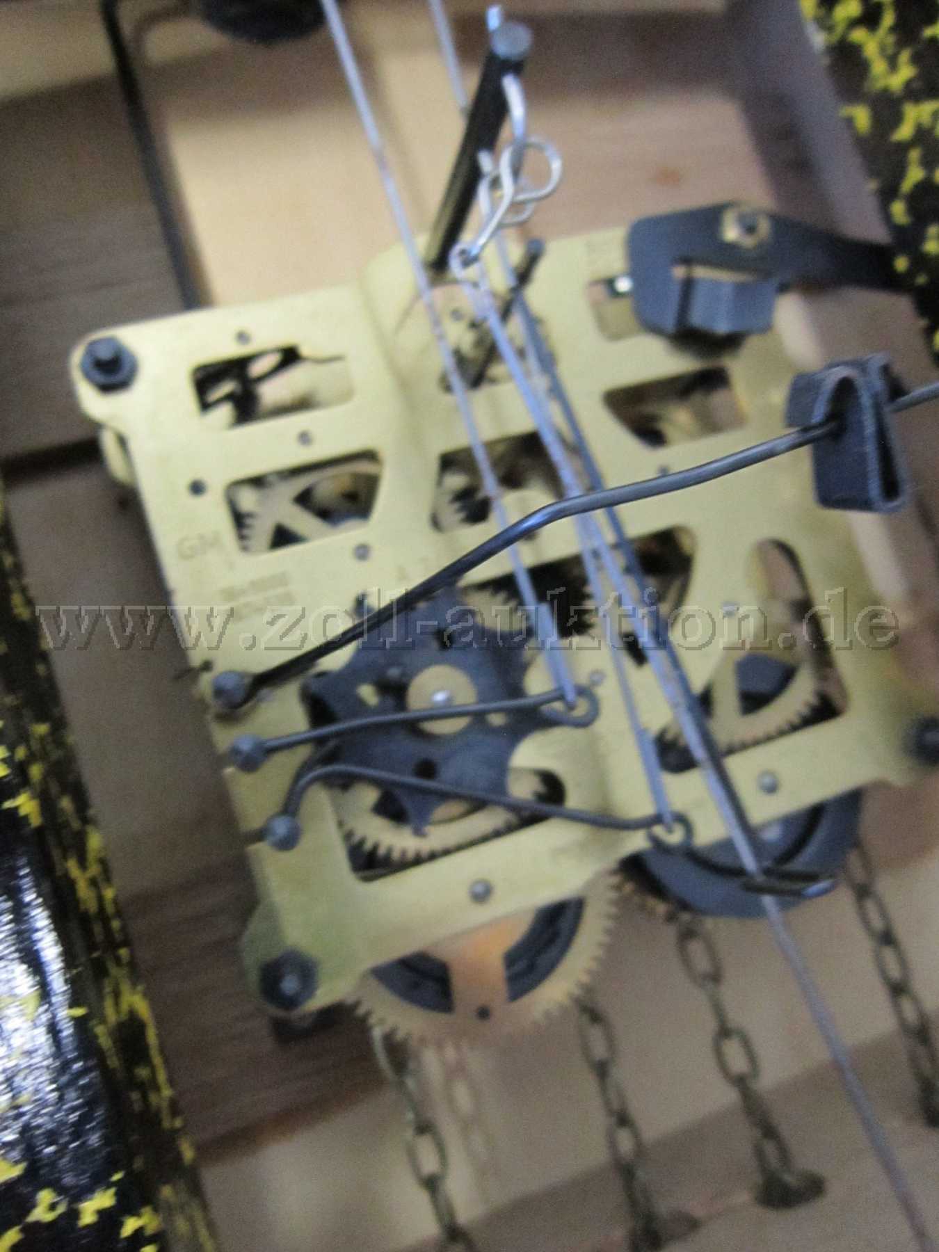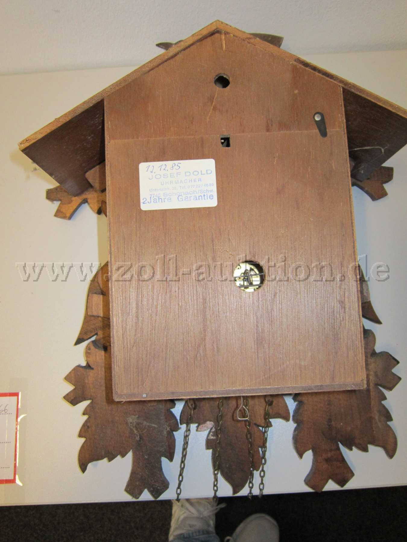 Die Wanduhr hat ein mechanisches Pendelwerk mit Kettenzug und Schlagwerk. Diese ist mit einem Gong und Kuckucksrufe zur vollen Stunde ausgestattet. Zusätzlich zum Schlag fährt aus einer Klappe oberhalb des Ziffernblattes ein Holzkuckucksfigur heraus. Das Gehäuse ist mit geschnitzten Holzornamenten verziert.