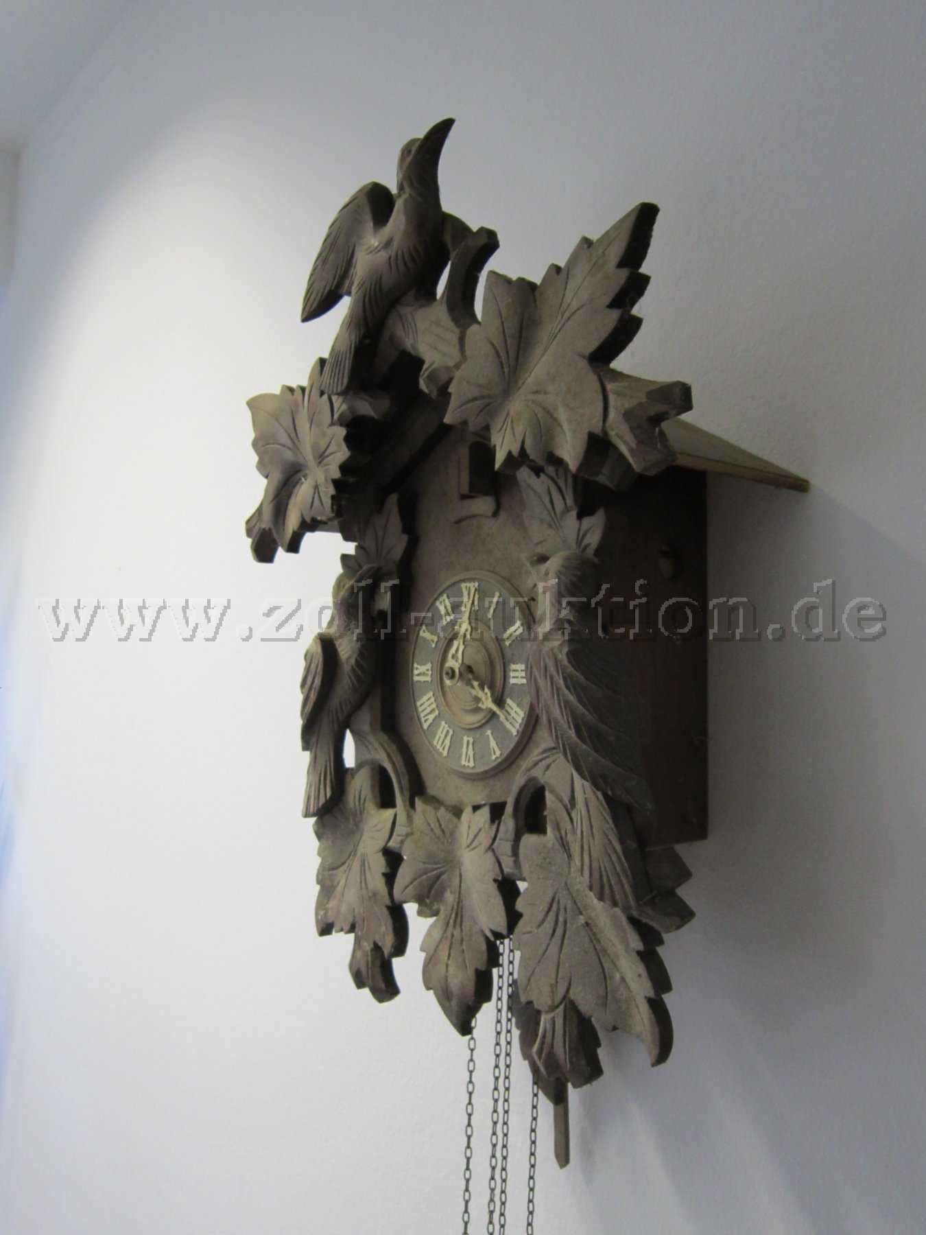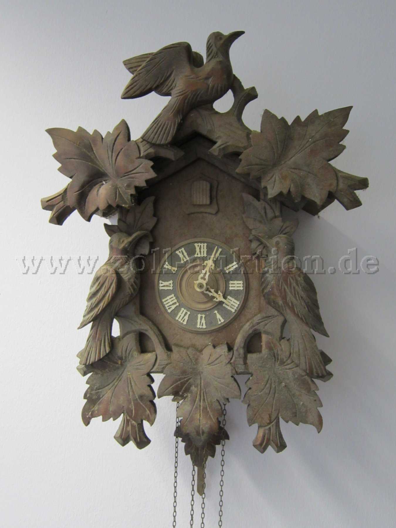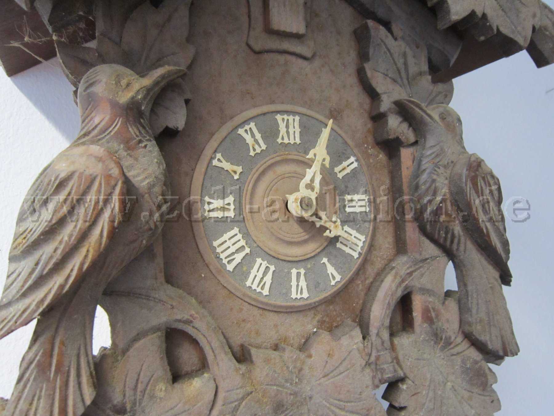 Angeboten wird eine gebrauchte Kuckucksuhr mit mechanischem Uhrwerk eines unbekannten Herstellers.