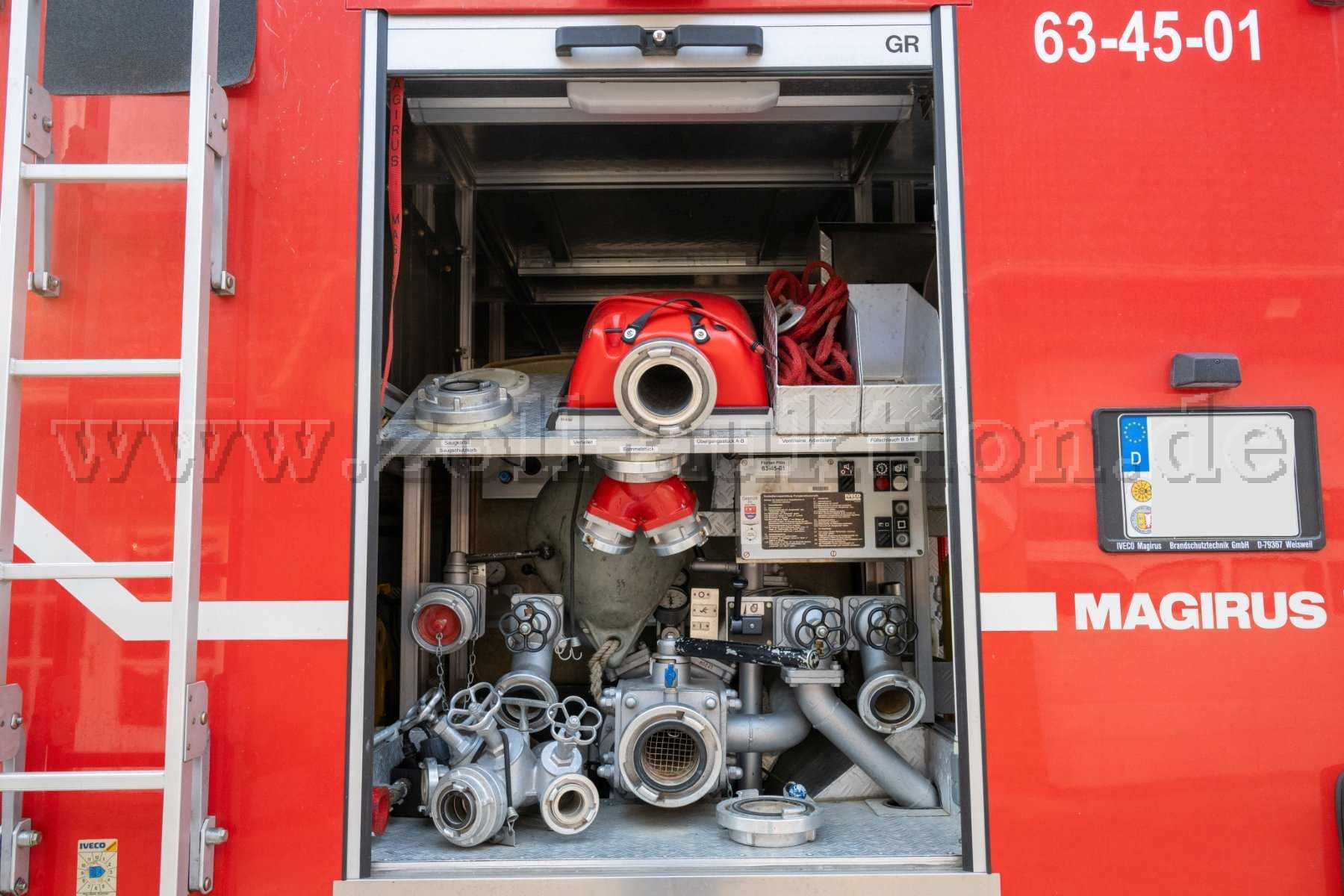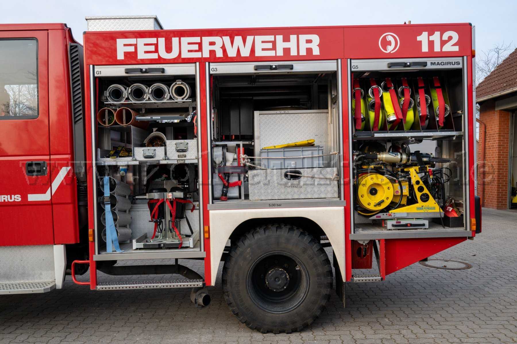 Auszüge in den Geräteräumen vorgesehen für zwei Atemschutzgeräte (G1), Stronerzeuger (G6), hydraulisches Rettungsgerät (G5), Tragkraftspritze (G2)