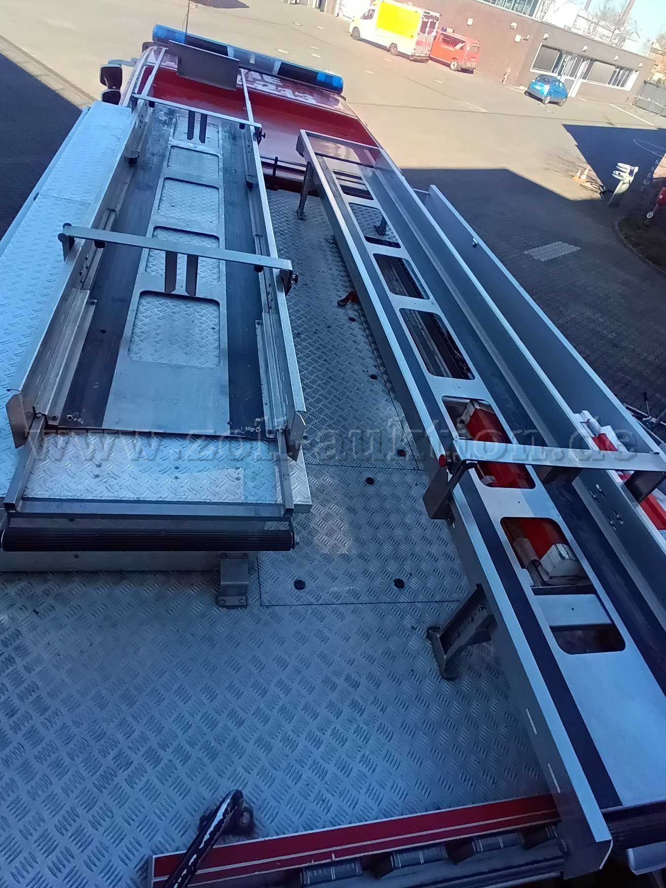 Eine Leiteraufnahme für die dreiteilige Schiebeleiter und 4 teilige Steckleiter befindet sich auf dem Fahrzeugdach sowie auf dem Staukasten