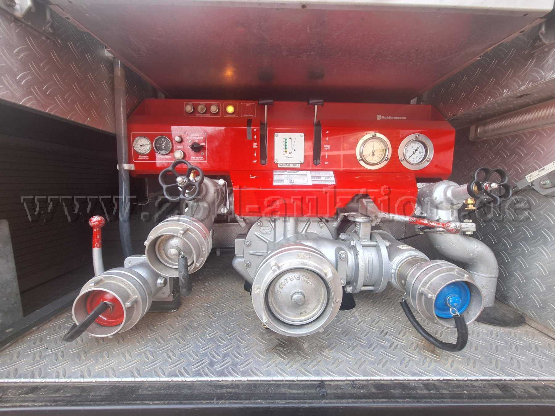 Fest mit dem Fahrzeug verbaut und somit mitversteigert sind ein 600 Liter fassender Wassertank sowie eine Pumpe der Marke Rosenbauer vom Typ FP 8/8. Die Pumpe ist vom Baujahr 1997 und ist 163 Betriebsstunden gelaufen.