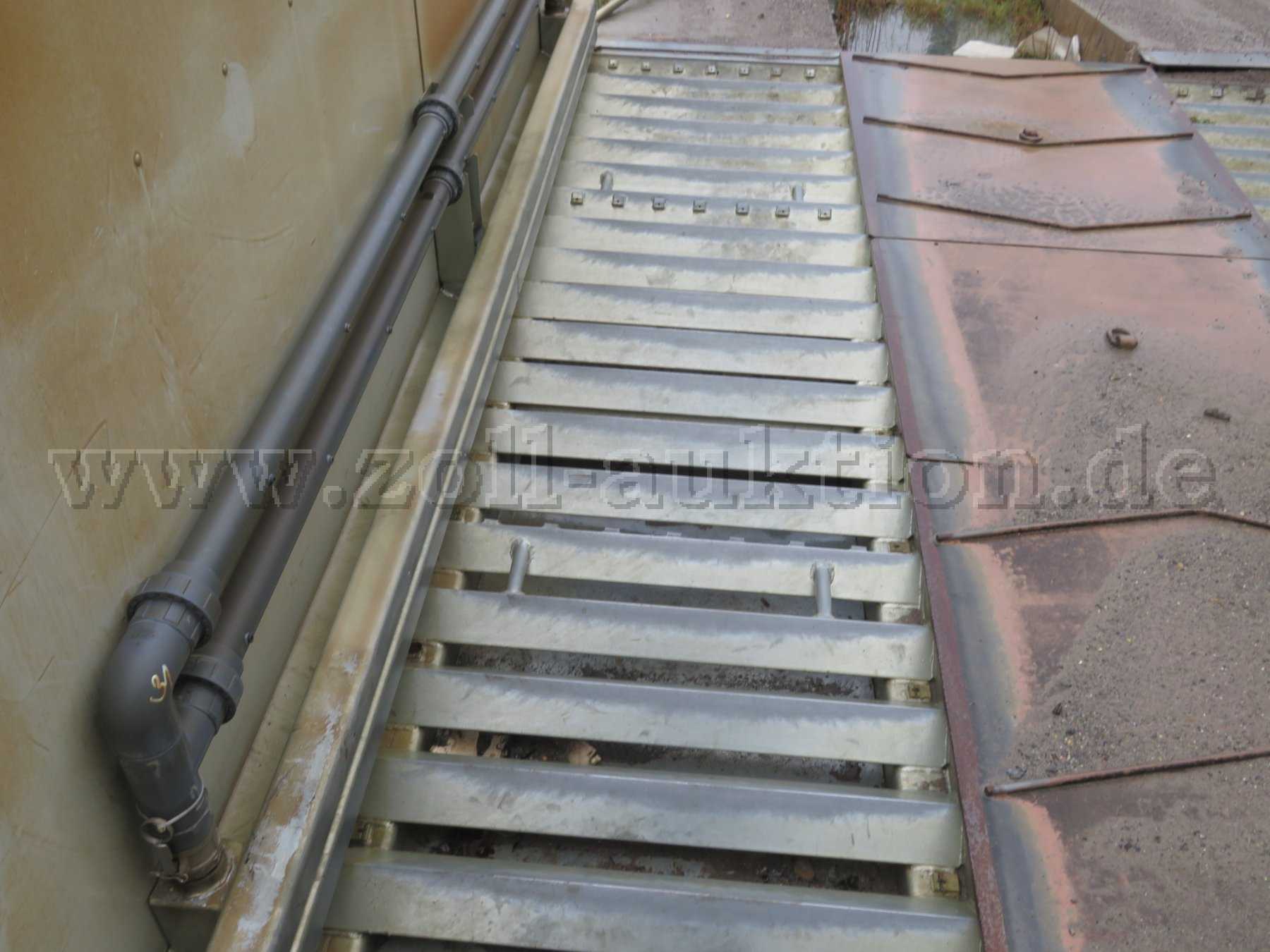 • Zwei massive, feuerverzinkte Waschmodule (links/rechts) mit integriertem Schmutzwasserablauf, ausgeführt in selbsttragender Stahlkonstruktion aus wasserführendem Rechteckstahlrohr und Winkelprofilen. Die Module sind 37,5 cm hoch auf GOK gestellt. 3 zur Schmutzwasserrückführung abgeschrägte Mittelteile aus feuerverzinktem Riffelblech Statisches Düsensystem zur lückenlosen Wäsche der Reifenprofile, Radflanken, Radinnenseiten und Teilbereiche des unteren Chassis Statisches Düsensystem zur lückenlosen Wäsche der Reifenprofile, Radflanken, Radinnenseiten und Teilbereiche des unteren Chassis